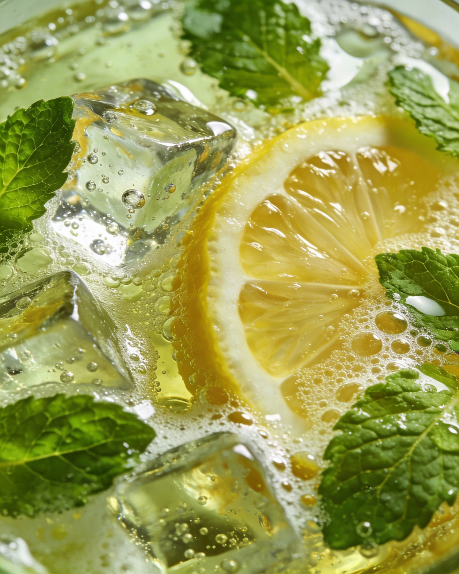 Close-up of a refreshing drink with lemon slices, ice cubes, and mint leaves, showcasing vibrant colors and a fresh, bubbly texture.