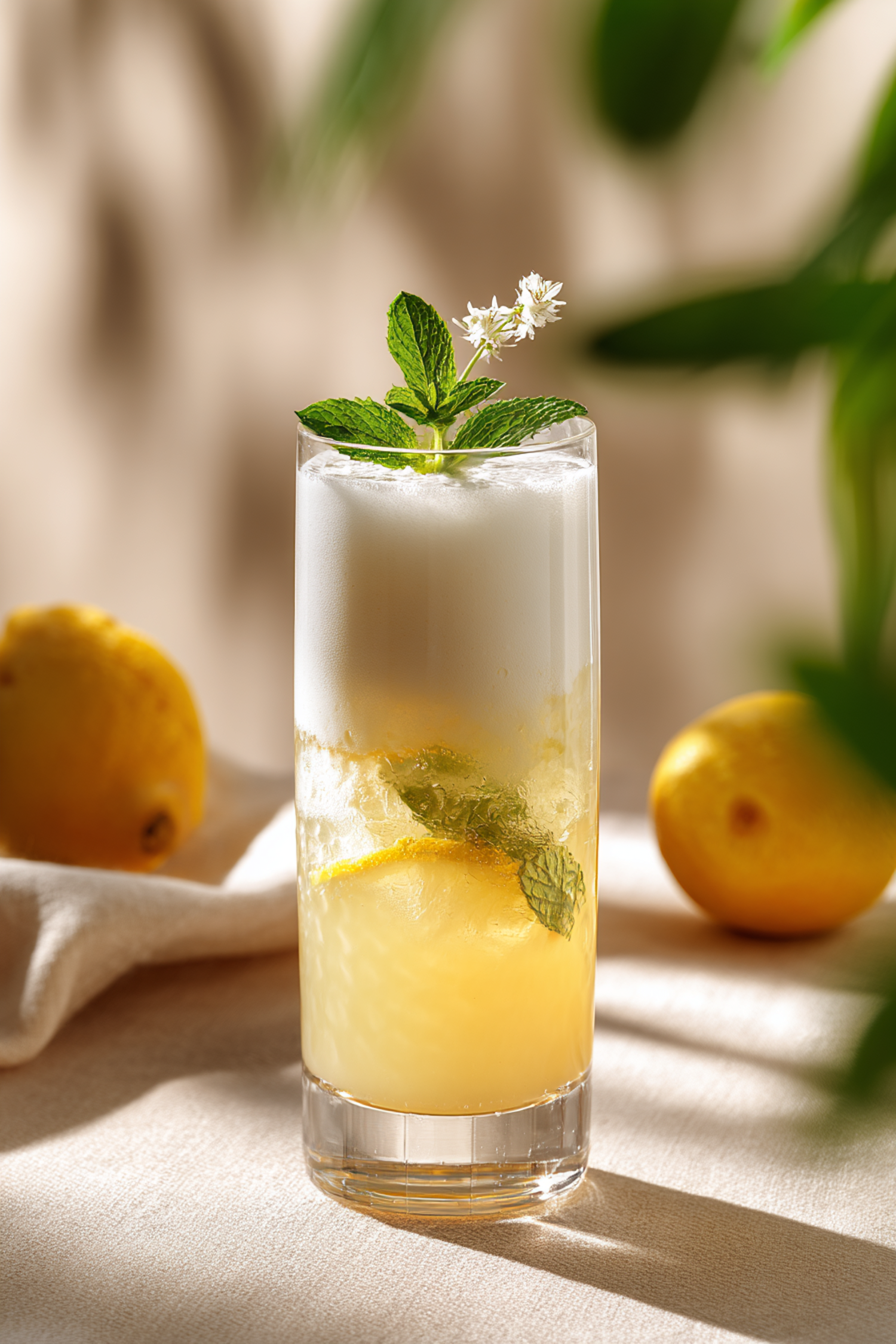 Refreshing lemon drink in a tall glass with mint garnish, frothy top, and ice cubes, set against a warm, natural background.