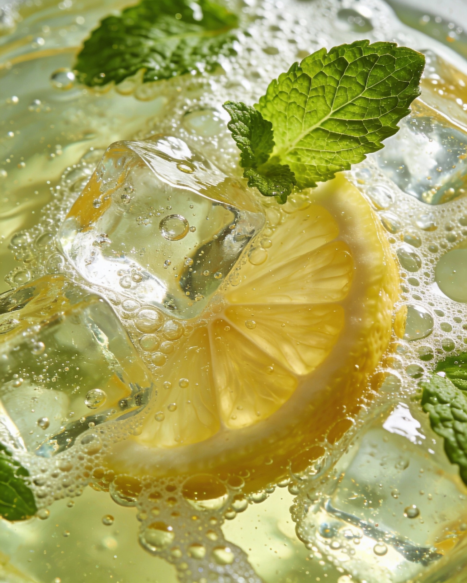 Ultra realistic macro photography of sparkling lemon soda with ice cubes, top-down close-up. The frame is filled with translucent pale yellow-green fizzy liquid, vibrant and fresh, with dense micro bubbles and foam clusters creating an organic pattern. Several sharp crystal-clear ice cubes visible with realistic refraction and tiny trapped air bubbles inside. A lemon wedge partially submerged with bright yellow pulp and visible segments. Add fresh mint leaves floating (vivid green, crisp veins, slightly curled edges), some leaves trapped under the foam. Strong highlights, glossy wet look, high-speed macro, premium drink campaign aesthetic, no glass rim