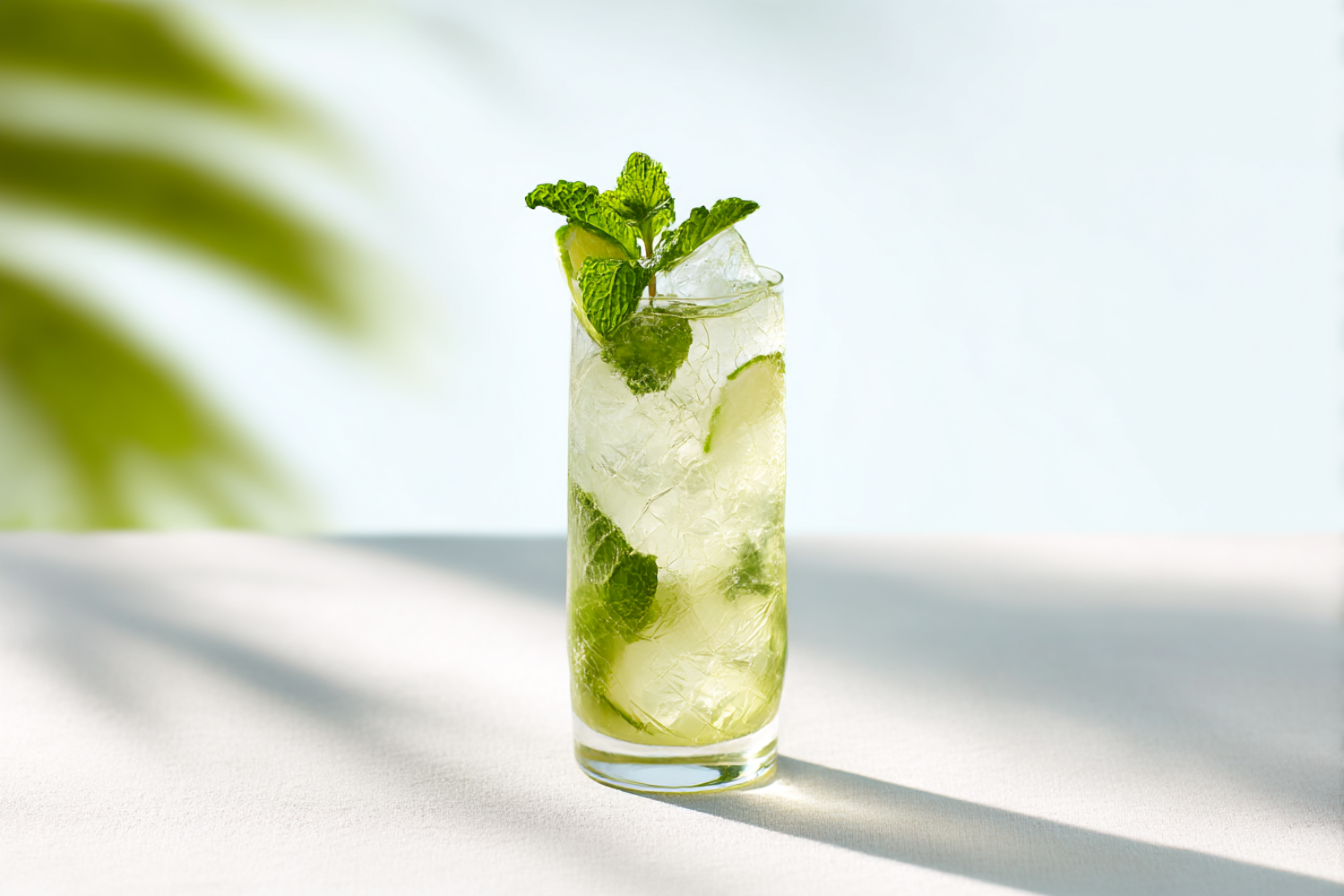 A refreshing mojito cocktail with lime, mint, and ice in a tall glass, set against a bright, tropical-inspired background.