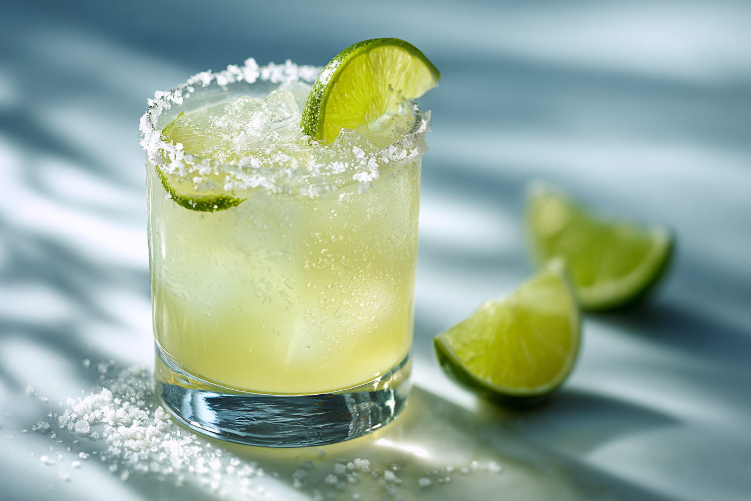 A chilled margarita with a salted rim and lime garnish, perfect for summer vibes. Ice cubes and lime wedges complete the refreshing look.