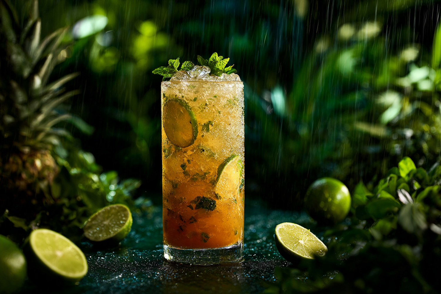 A refreshing cocktail with lime and mint in a tall glass, surrounded by fresh limes and tropical greenery, perfect for a summer vibe.