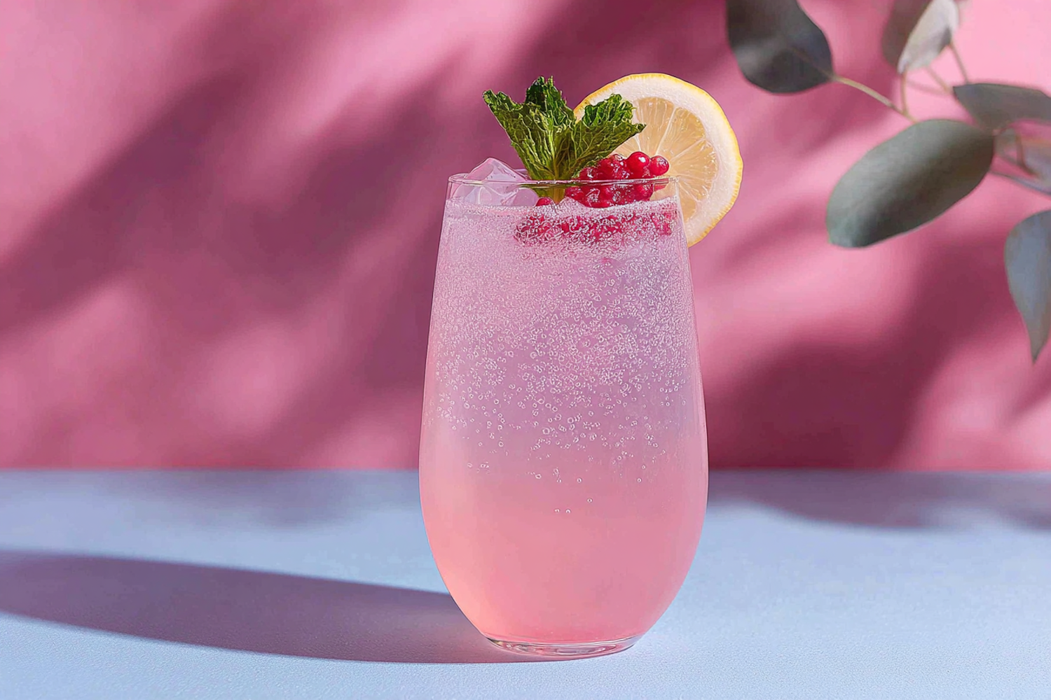 A fizzy pink drink in a glass, garnished with lemon, mint, and berries, set against a pink background with a light blue surface.