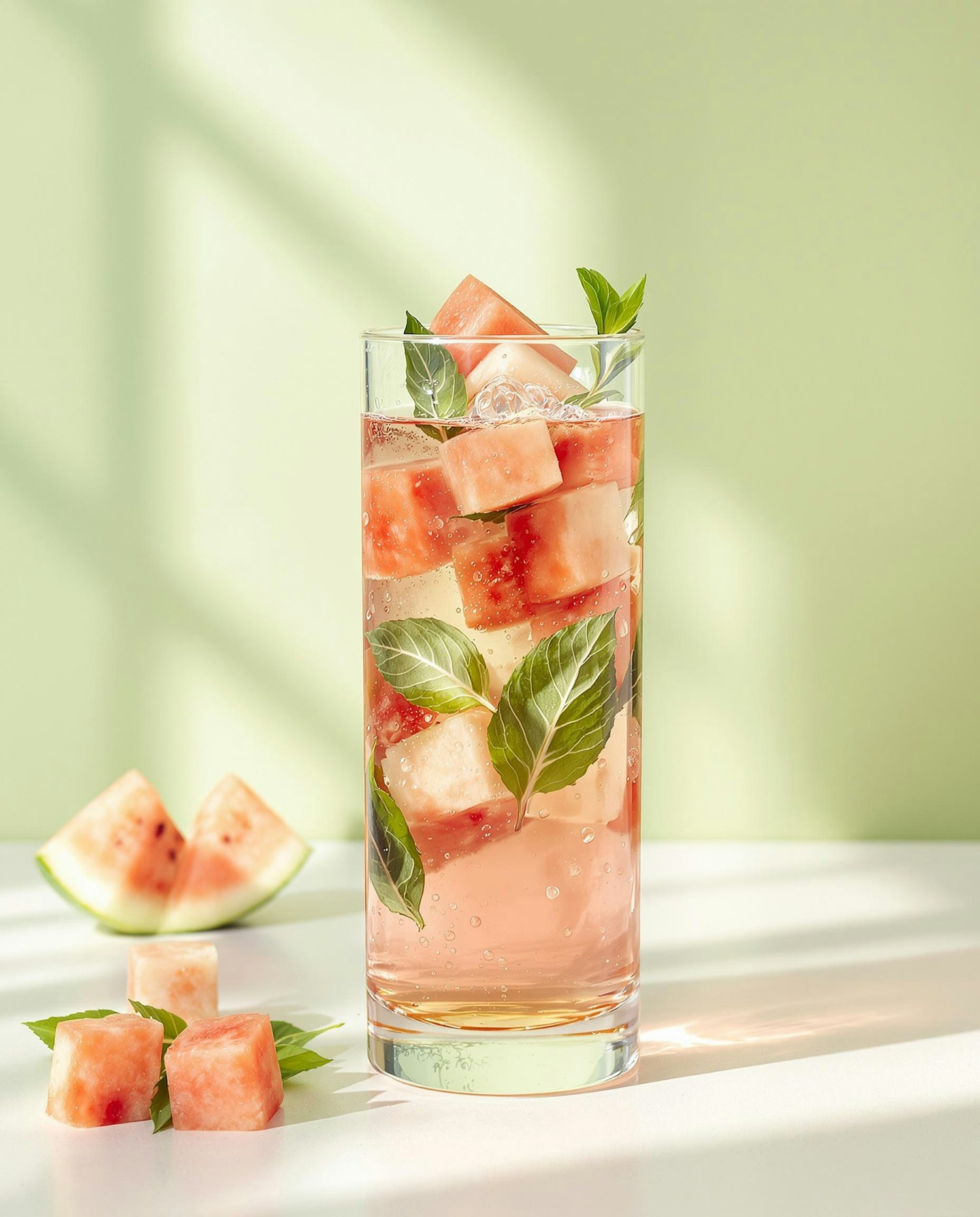Refreshing drink with watermelon chunks, basil leaves, and ice in a clear glass, perfect for a sunny day.