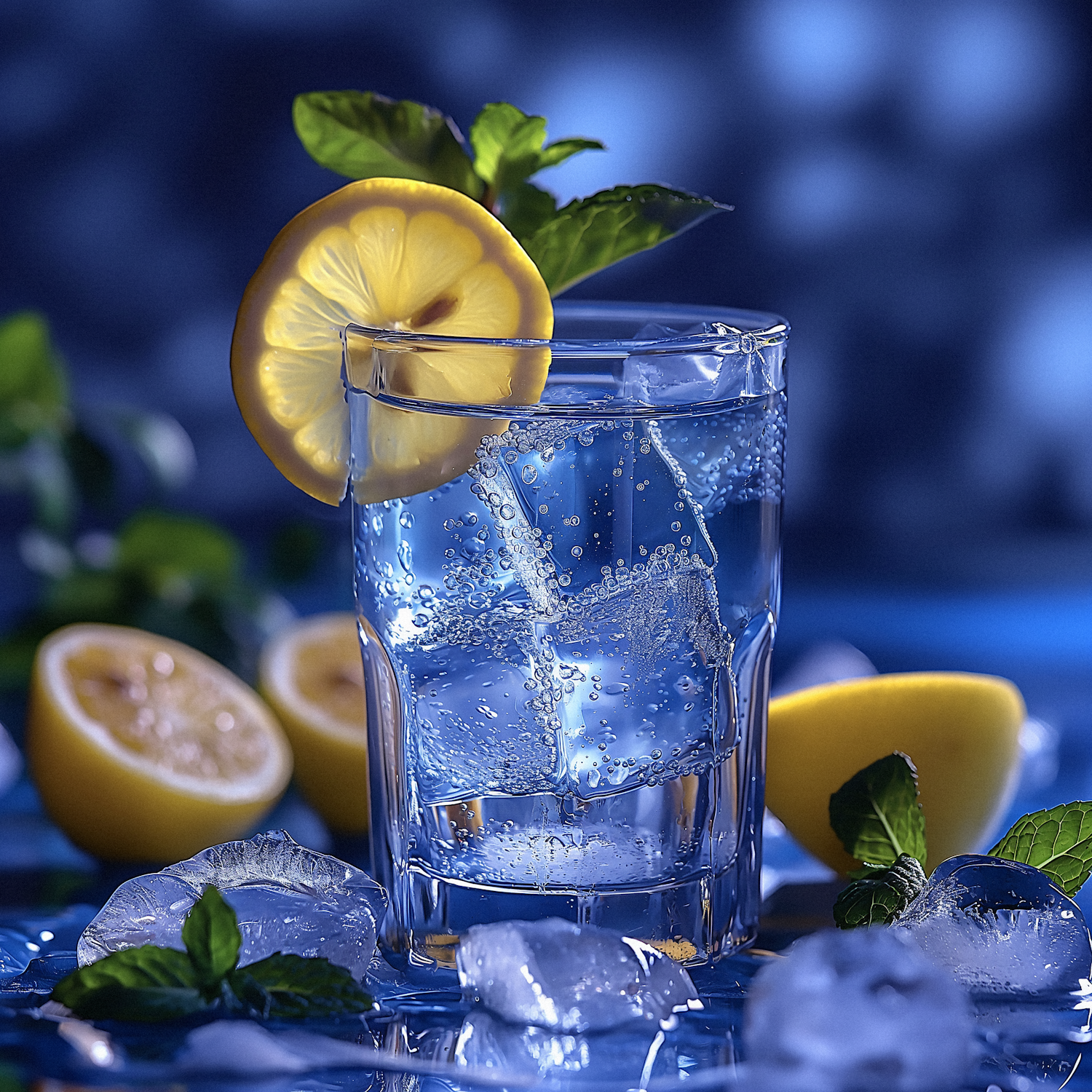 Refreshing glass of sparkling water with lemon and mint, surrounded by ice cubes and halved lemons, set against a cool blue background.