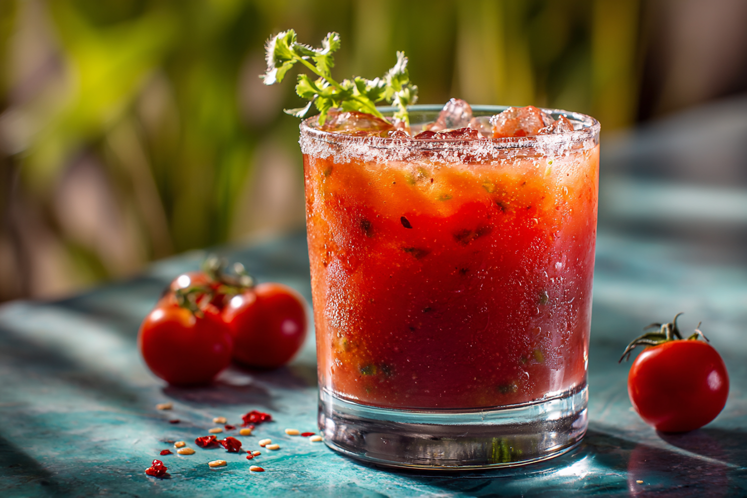 Refreshing tomato-based cocktail with a salted rim, garnished with herbs, surrounded by cherry tomatoes and chili flakes on a turquoise table.