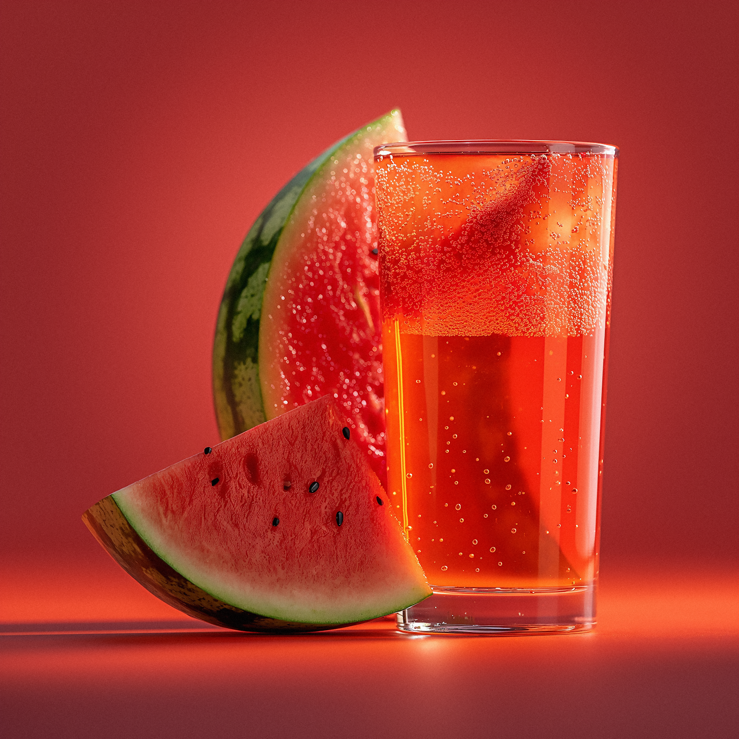 Refreshing watermelon soda with effervescent bubbles, paired with juicy watermelon slices against a vibrant red background.