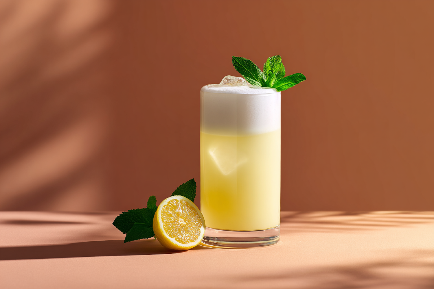 A vibrant yellow cocktail with frothy foam, mint garnish, and a halved lemon on a peach surface, perfect for a refreshing summer vibe.