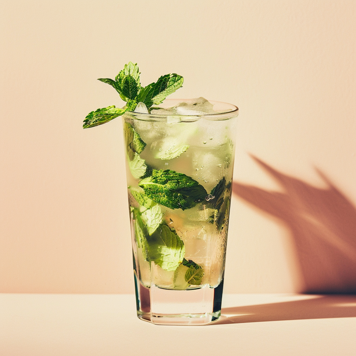 Refreshing mojito cocktail with mint leaves and ice in a tall glass against a warm beige background.