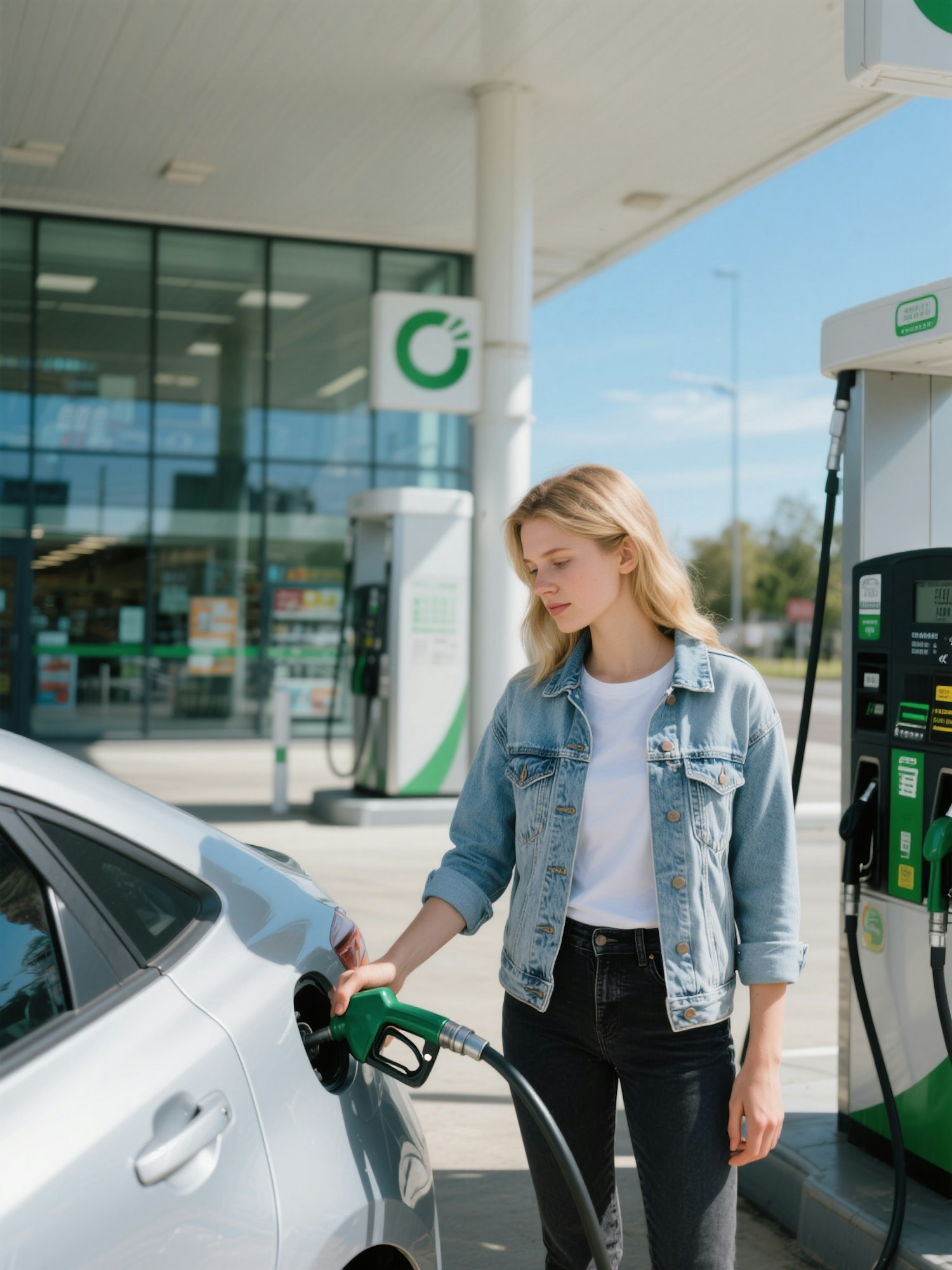 A young woman at a modern gas station, filling her car’s fuel tank. She is standing beside a sleek compact car, holding the fuel pump handle.