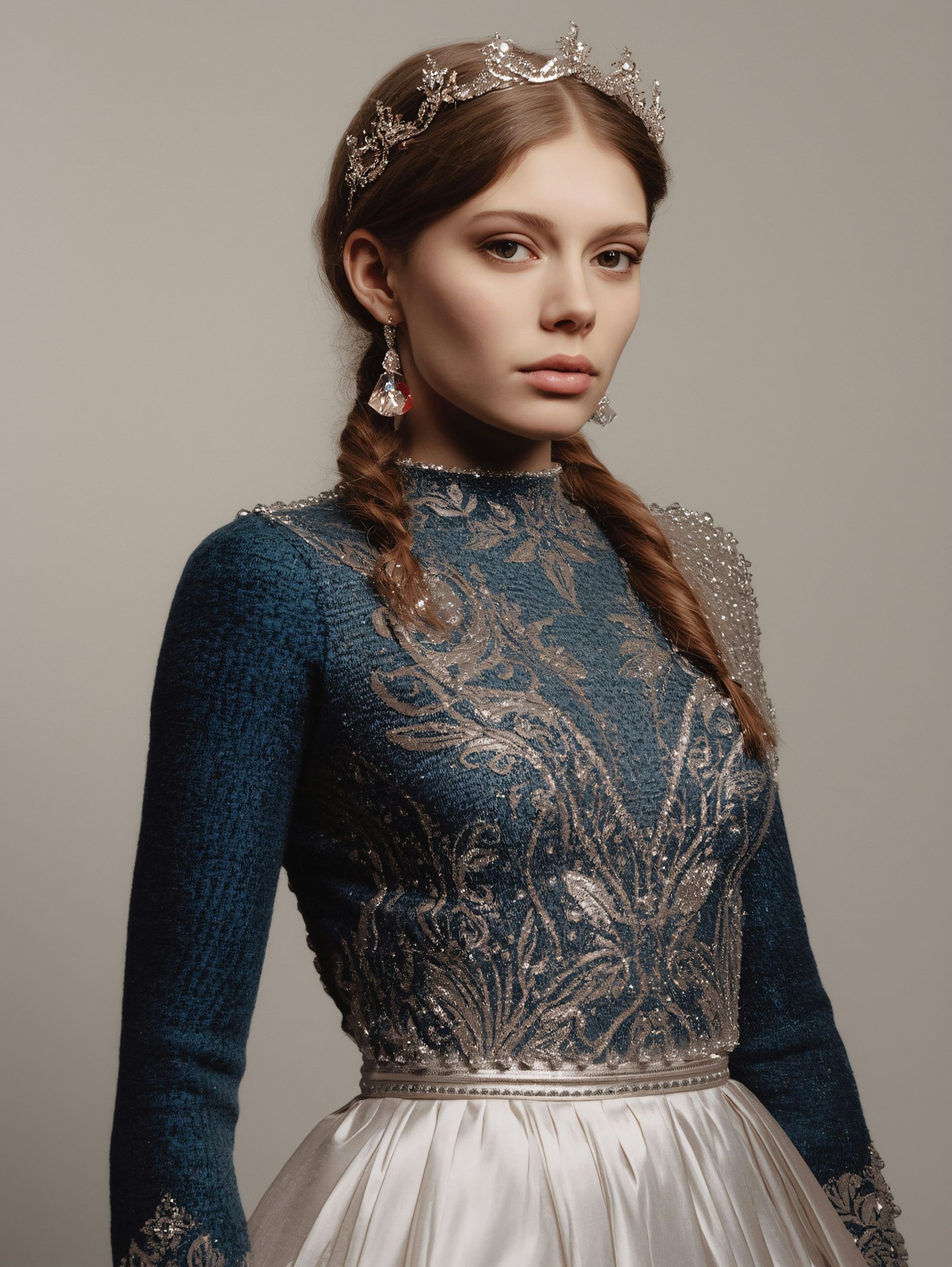 A poised woman in a blue embroidered top and white skirt, adorned with a silver tiara and earrings, against a neutral background.