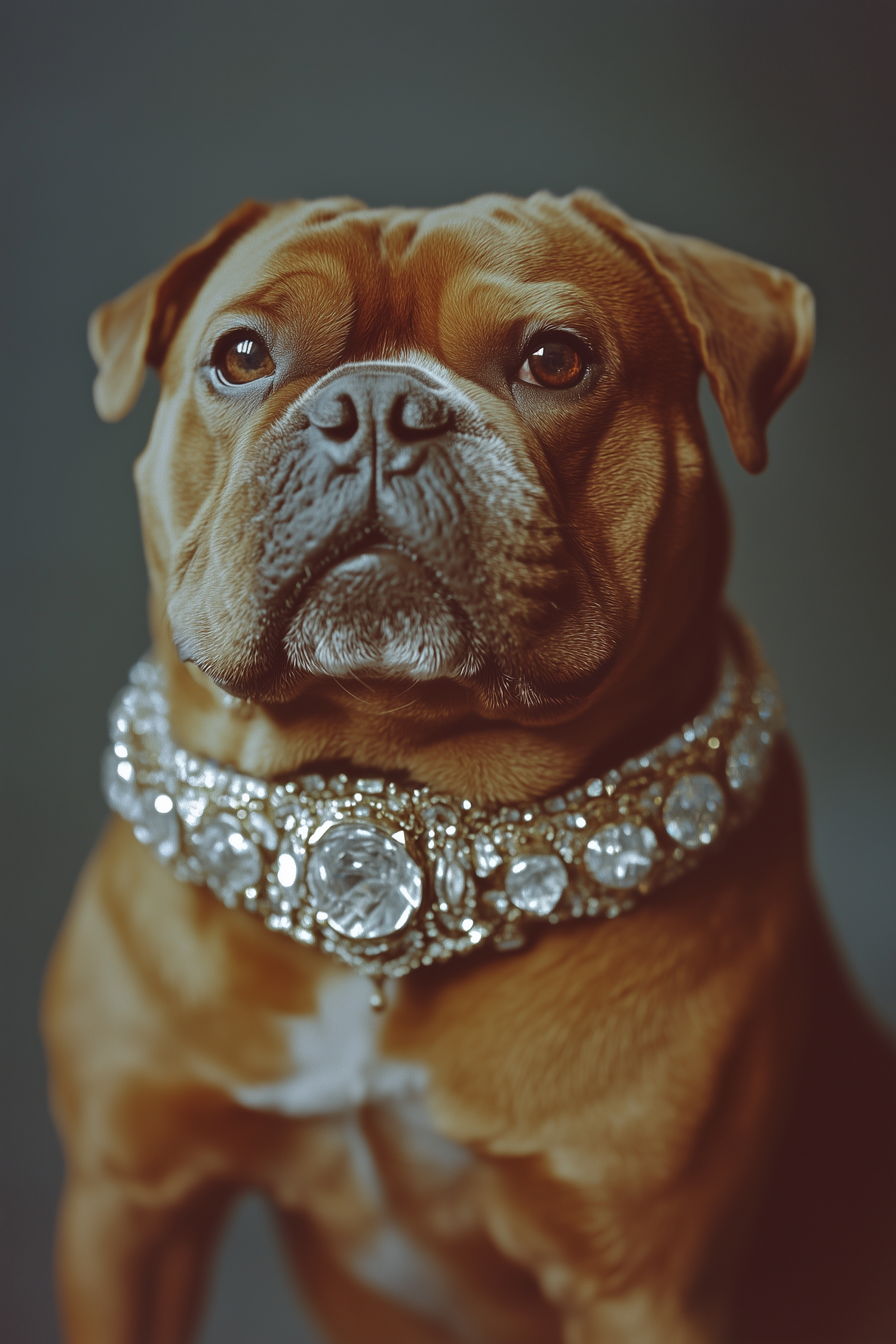 A brown bulldog with a jeweled collar exudes elegance and charm against a muted gray background.