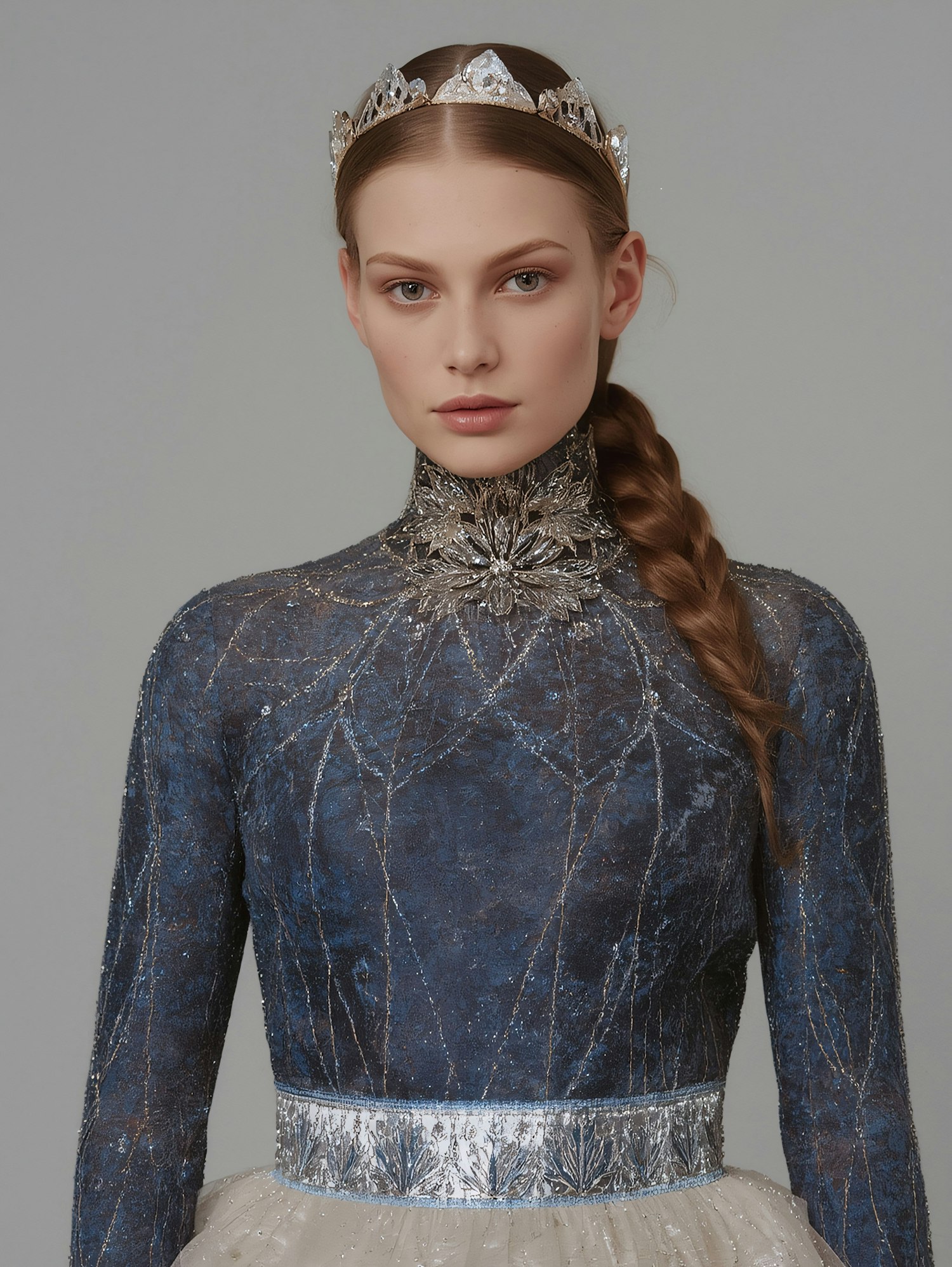 A woman in a blue and silver embroidered dress with a tiara, showcasing elegance and intricate design against a neutral background.