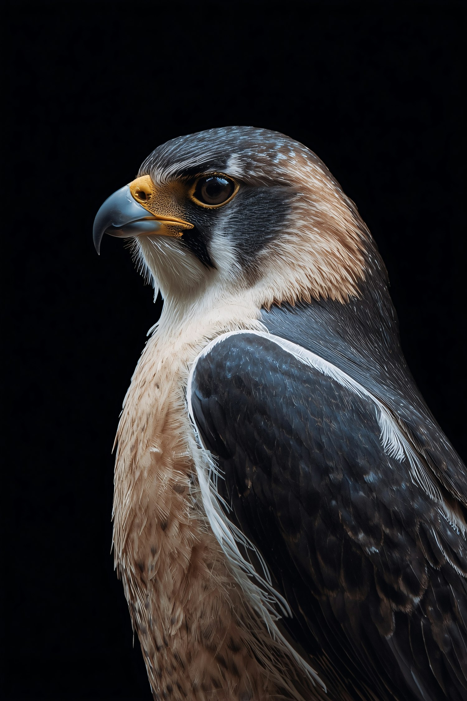 A stunning close-up of a falcon with detailed plumage and sharp features, set against a black background for dramatic effect.