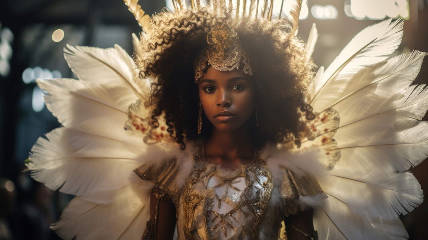 A young girl in a regal costume with gold and white feathers, exuding an ethereal and angelic presence with her voluminous curly hair.