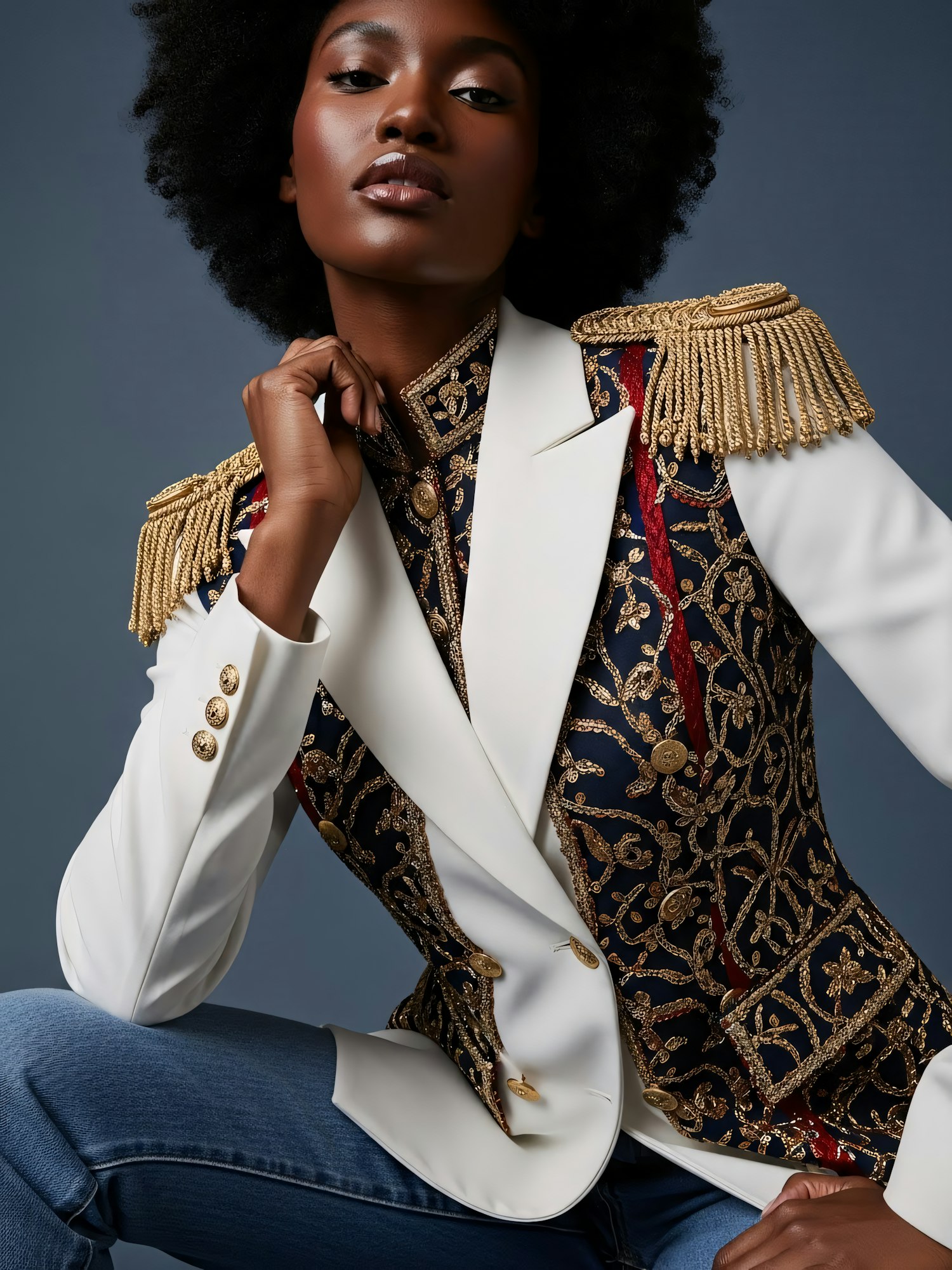 A stylish individual in a white blazer with gold embroidery and epaulets, paired with blue jeans, poses confidently against a gray background.