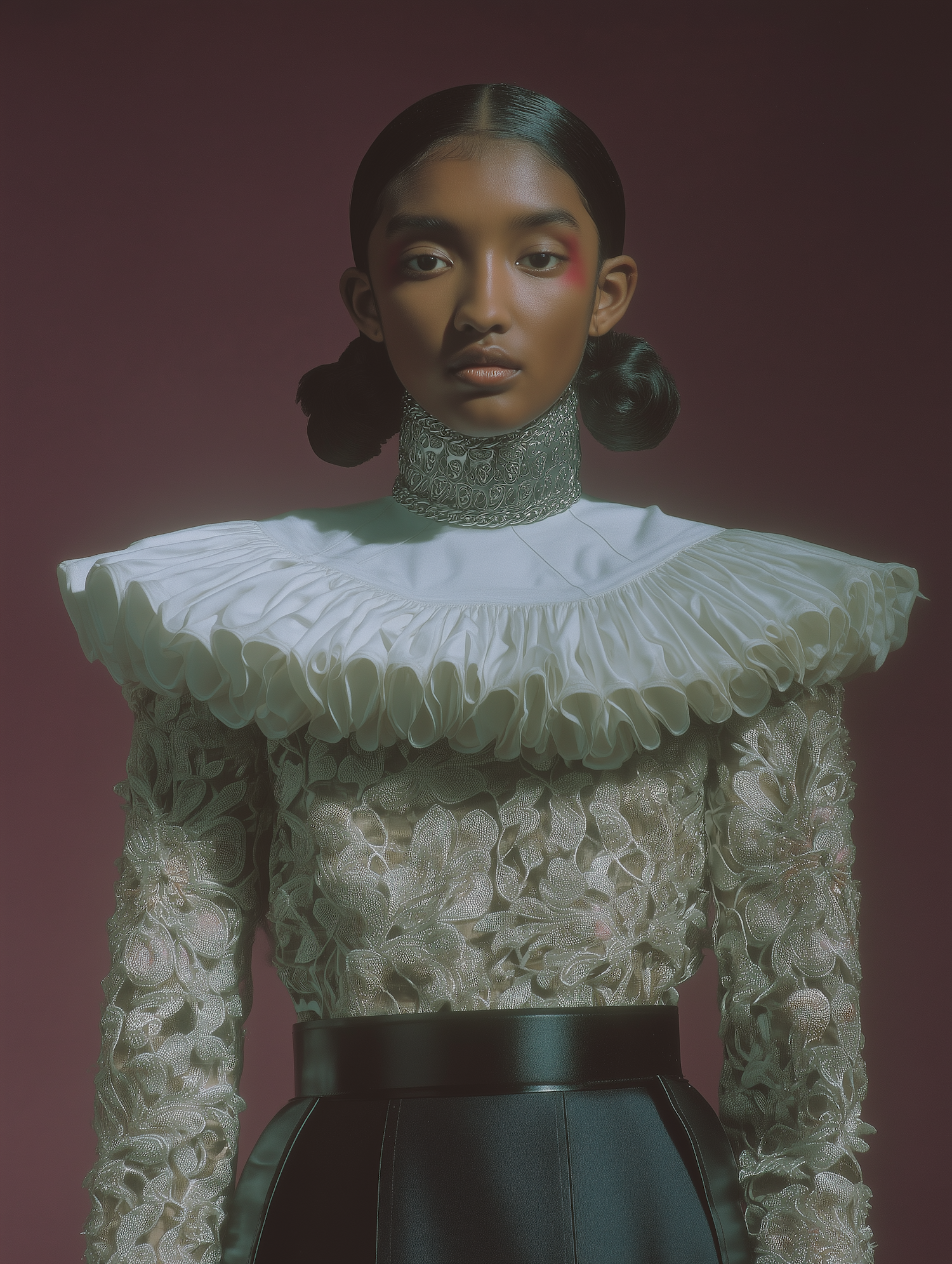 A portrait of a person wearing an elegant, intricately designed outfit with striking details, set against a minimalist background.