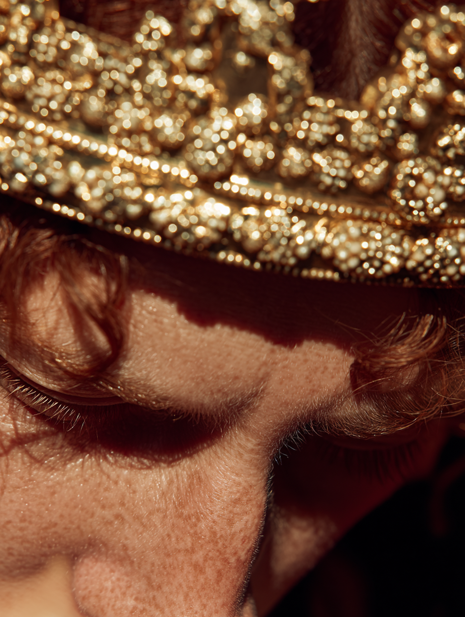 Close-up of a freckled face with red curls and a golden ornate crown, highlighted by dramatic lighting against a dark background.
