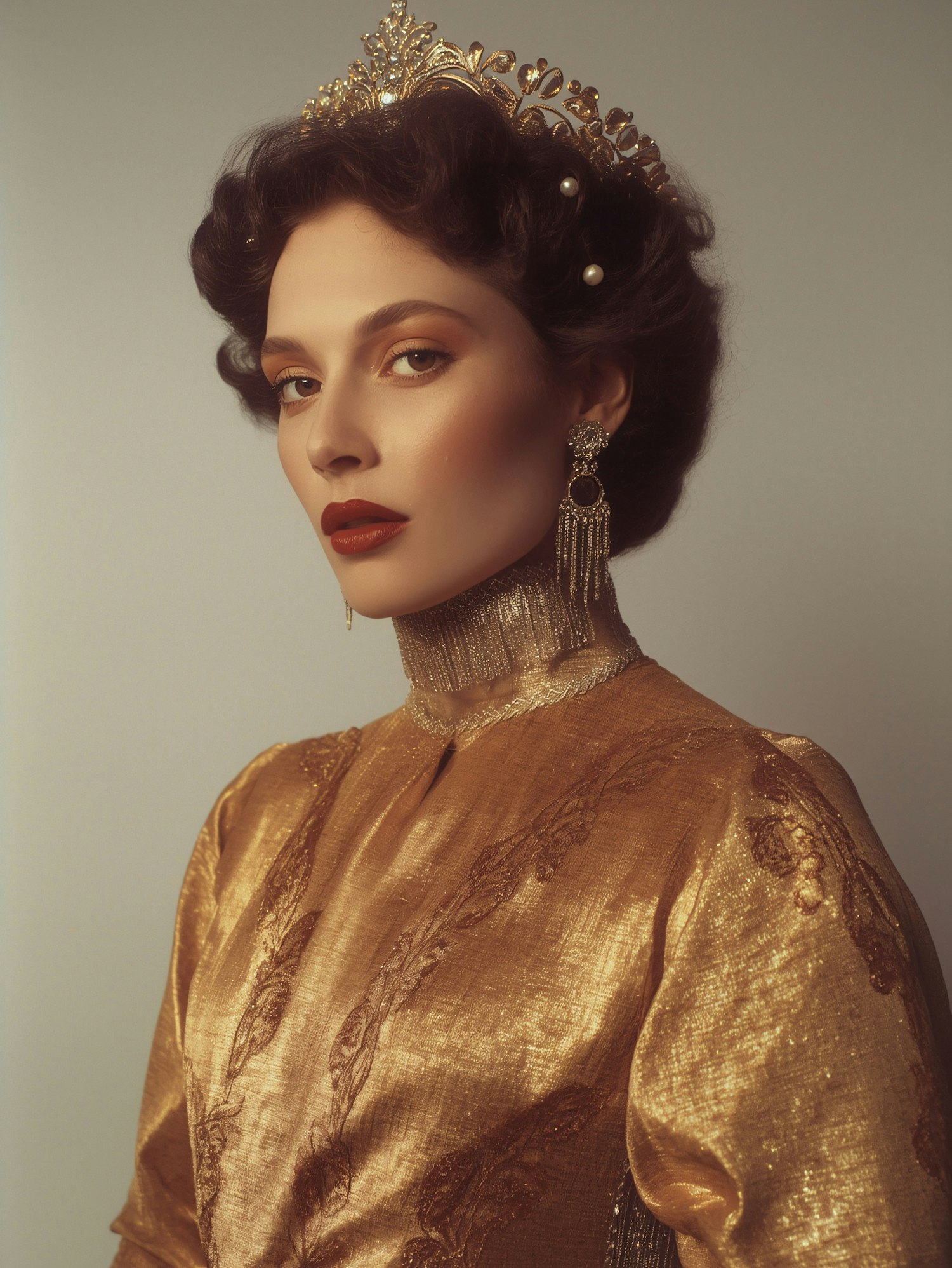 A regal woman in a golden gown and crown, exuding elegance with her refined makeup and intricate accessories.