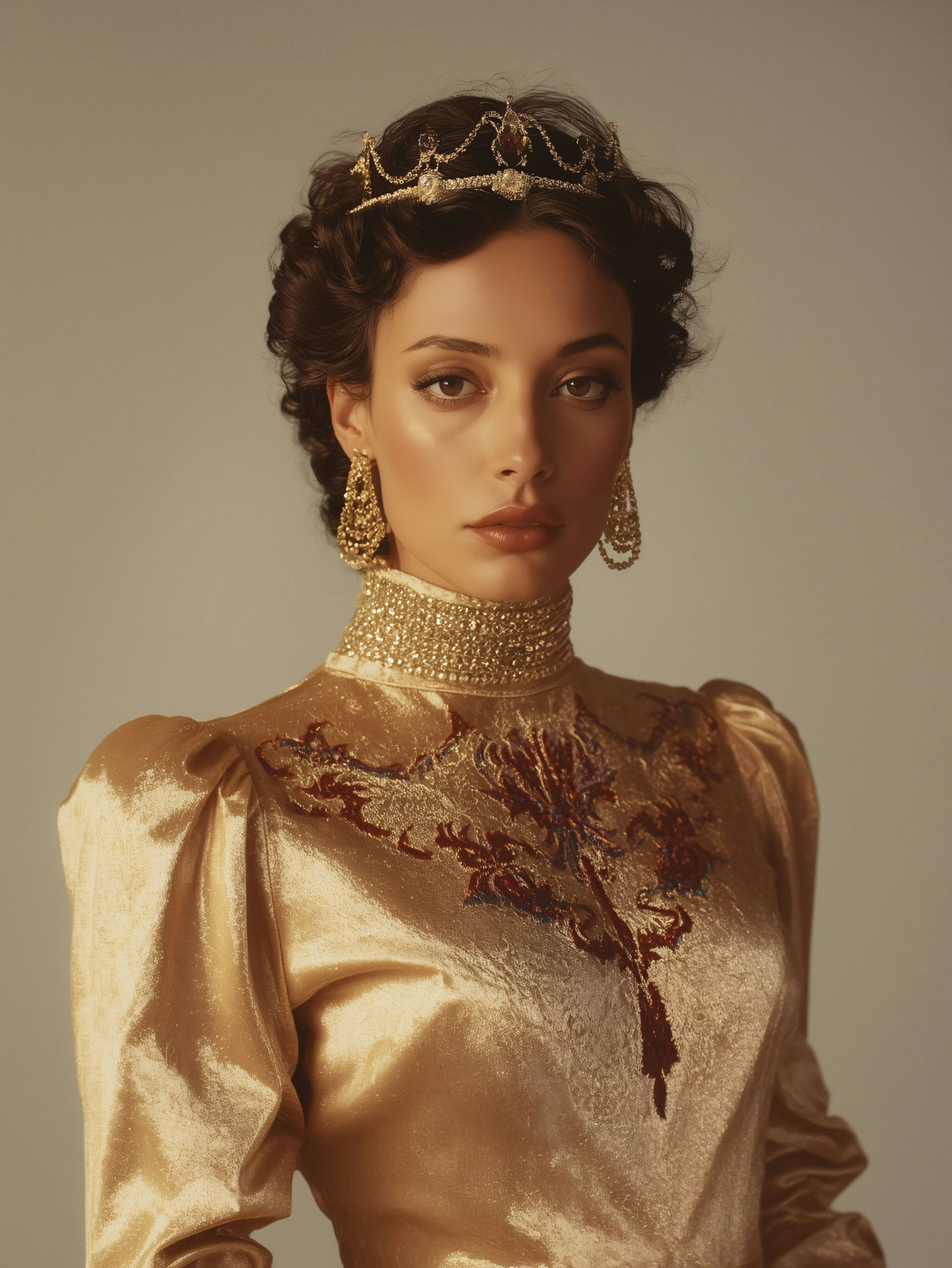 A regal woman in a golden gown and crown, exuding elegance with intricate embroidery and ornate jewelry, set against a neutral backdrop.