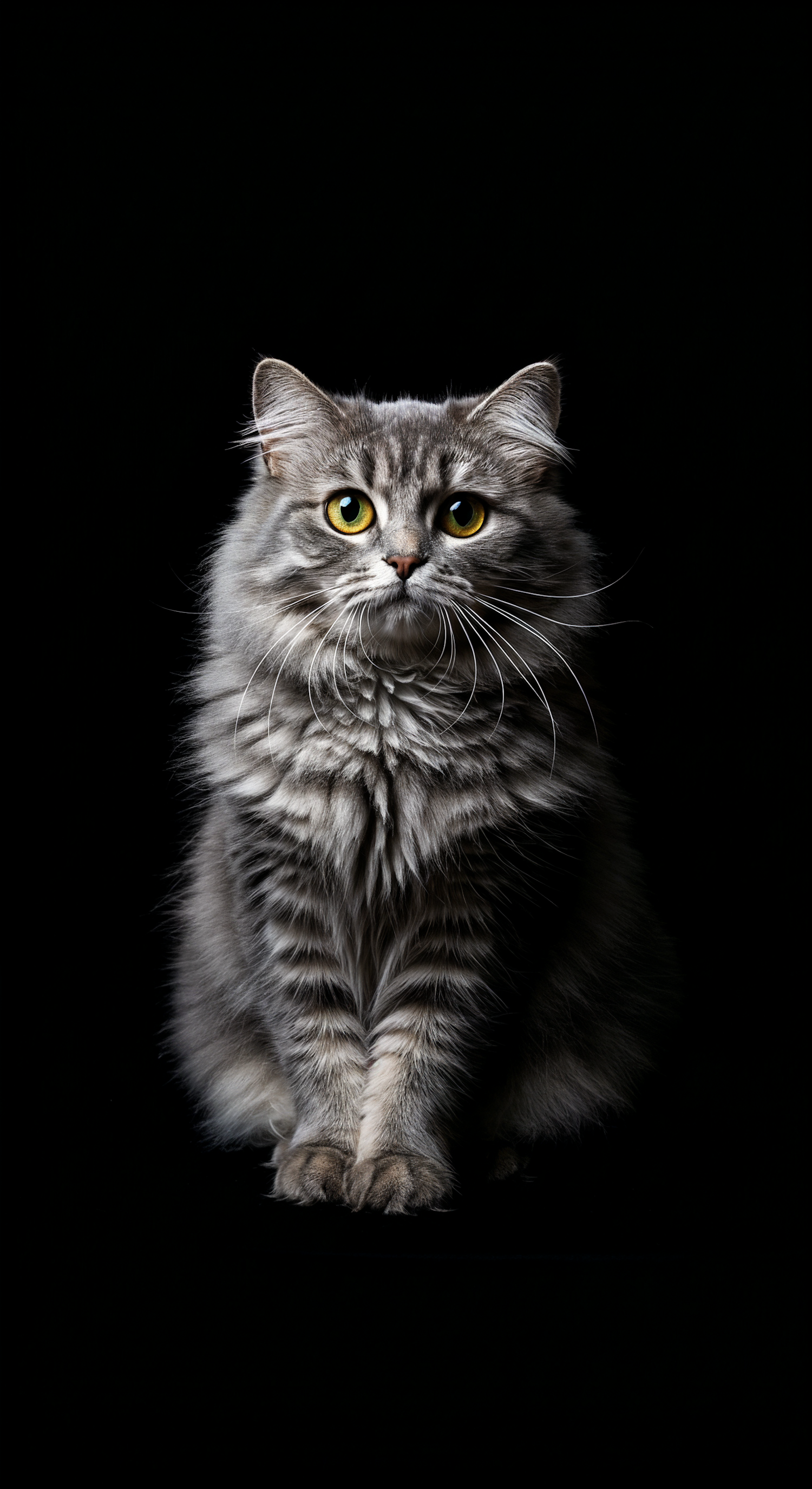 A majestic gray tabby cat with piercing yellow eyes sits against a black background, showcasing its fluffy fur and striking features.