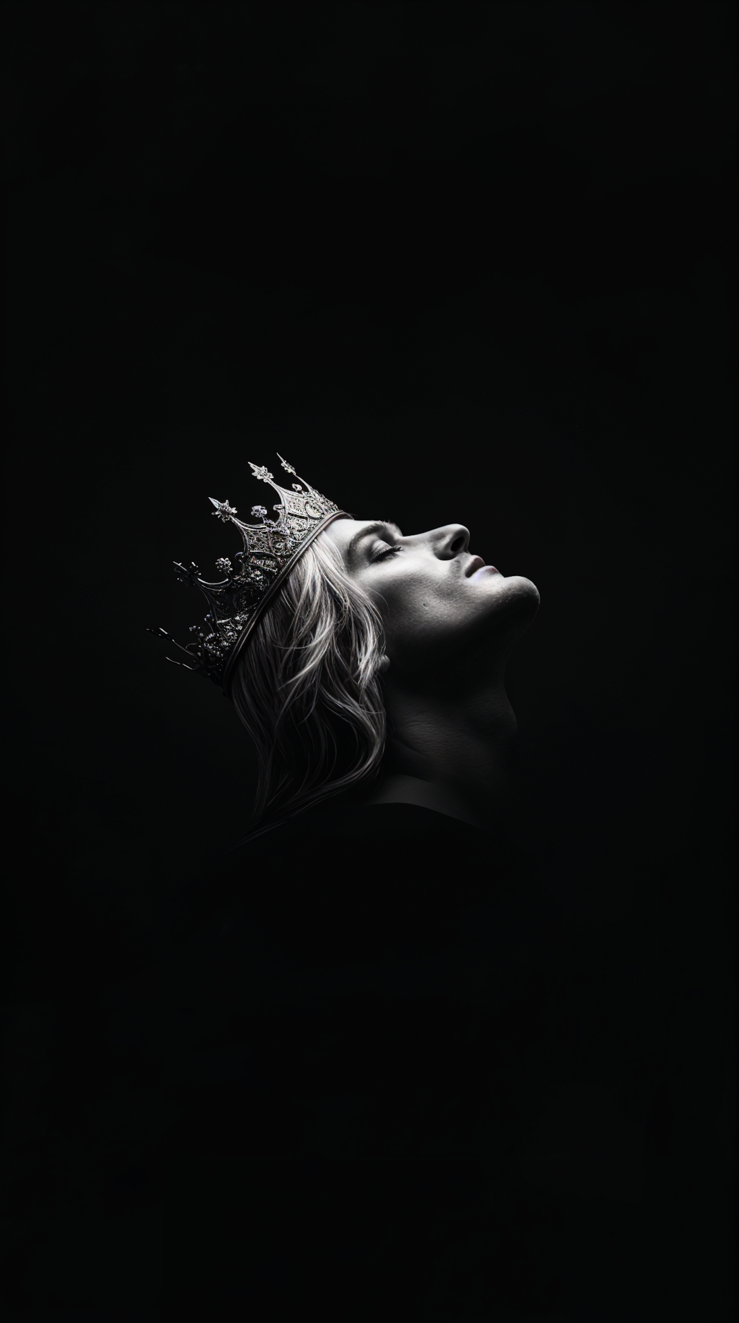Dramatic portrait of a crowned individual in profile, with serene expression and striking lighting against a dark background.
