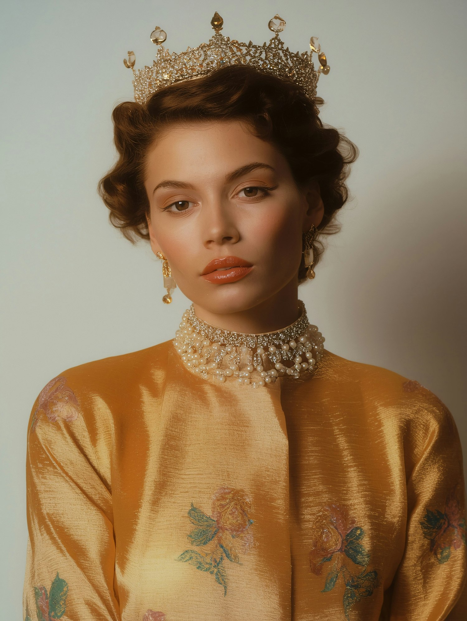 A regal portrait of a woman in a golden crown and embroidered attire, exuding elegance with her pearl jewelry and soft curls.