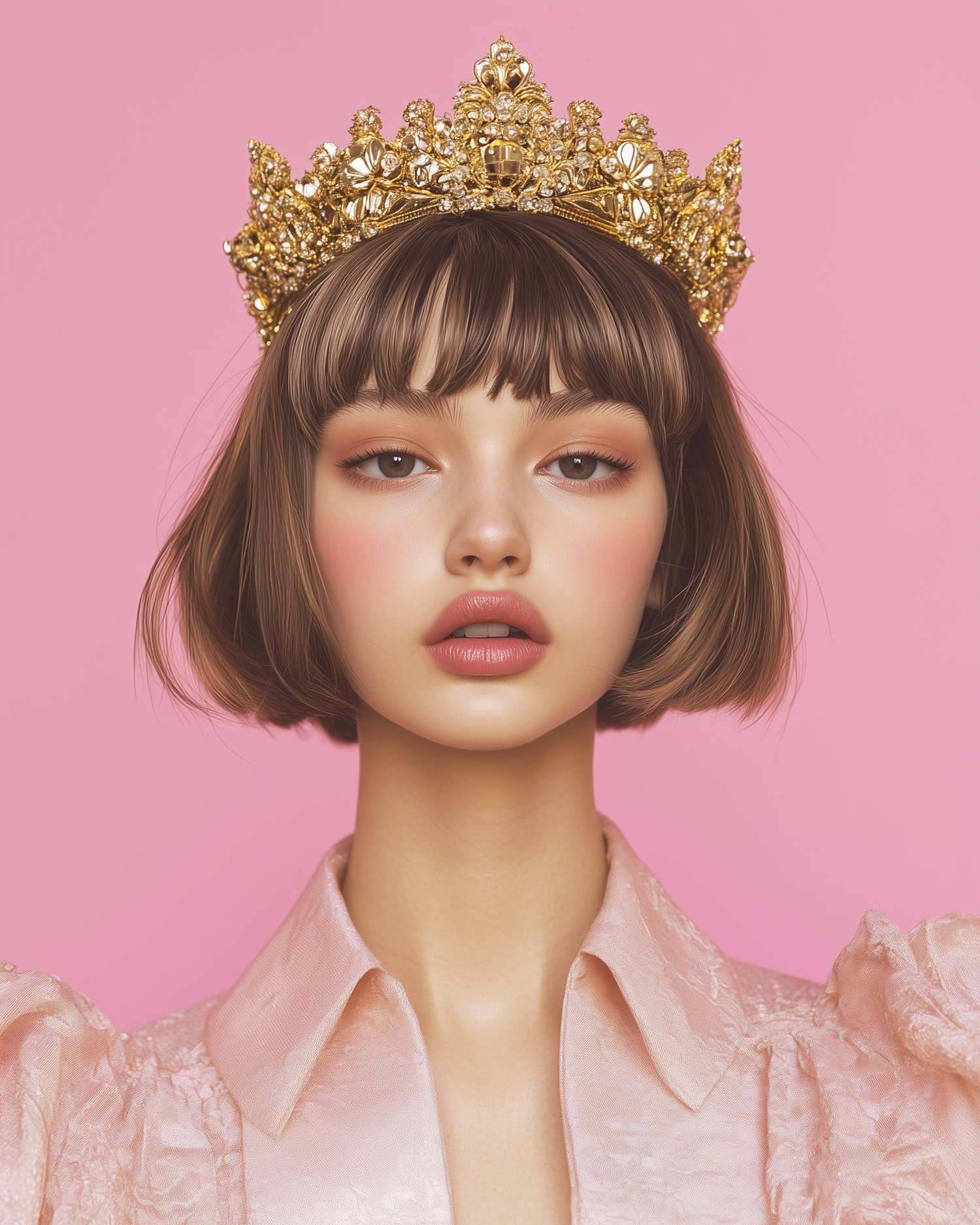 Elegant woman with a golden crown and pink blouse against a pink background, exuding regal charm and sophistication.