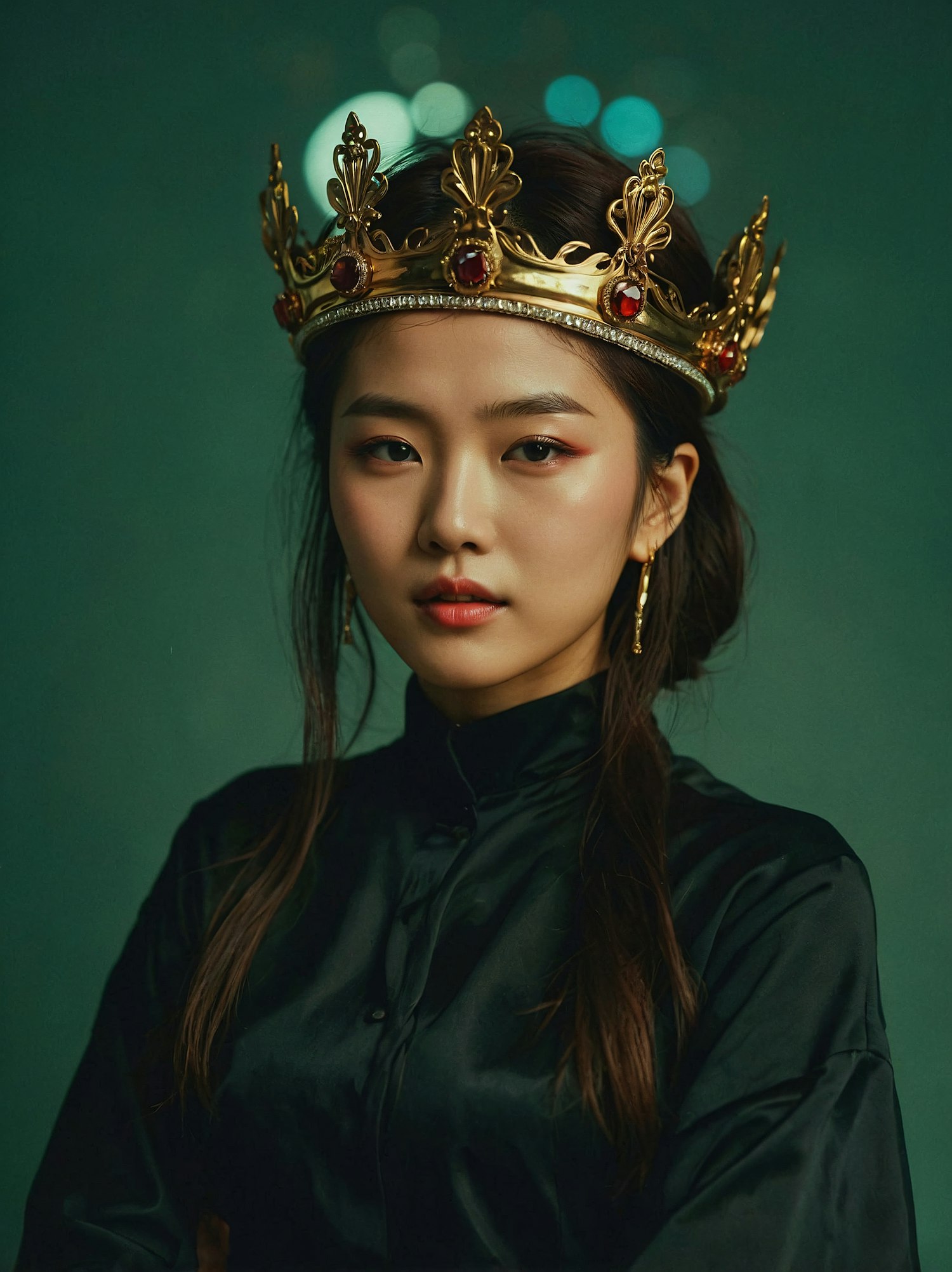 Majestic figure in a golden crown with red gems, wearing a dark silky outfit against a muted green backdrop. Face blurred for anonymity.