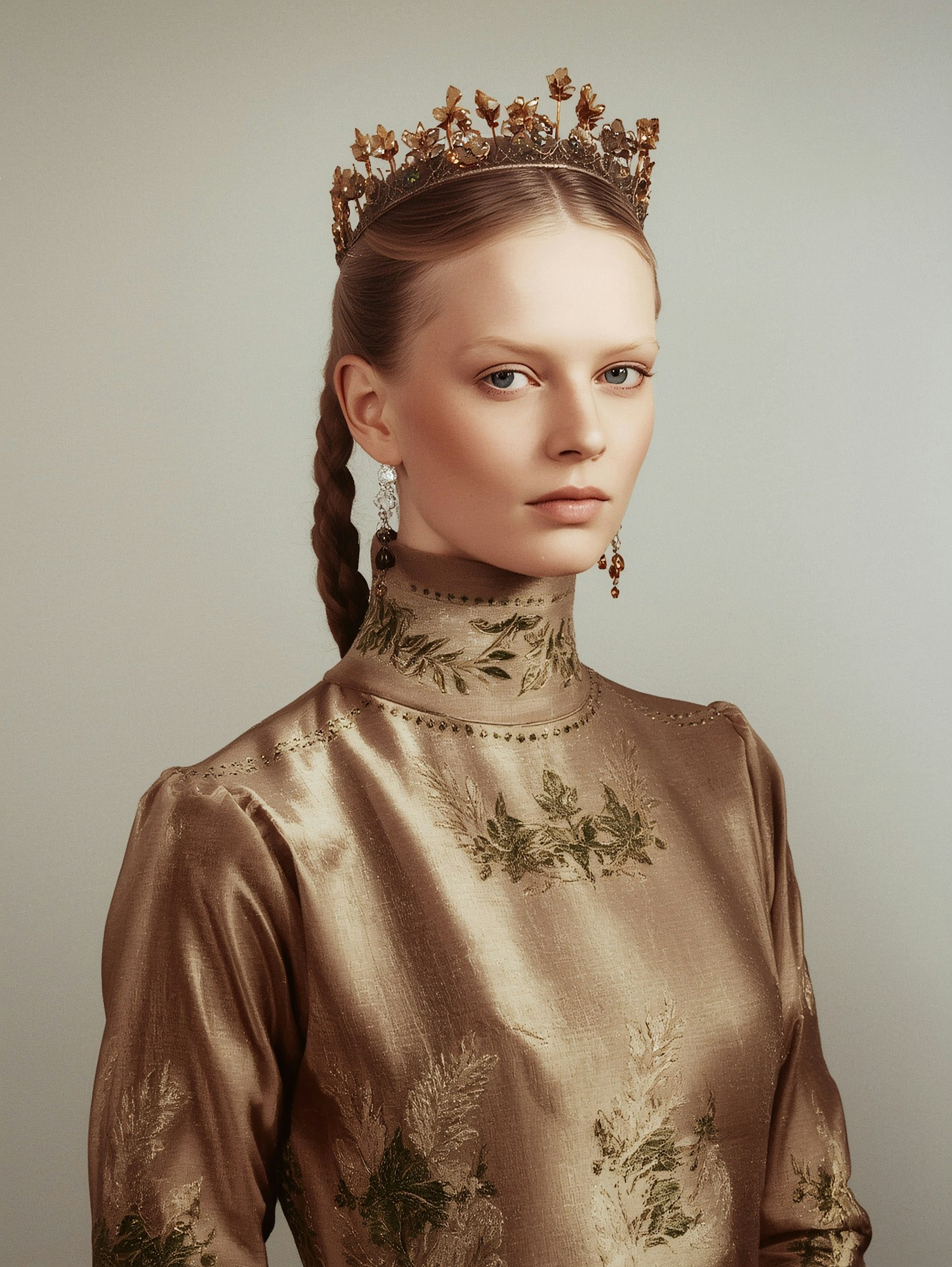 A regal portrait of a woman in a golden gown with a floral crown, exuding elegance and sophistication against a neutral backdrop.