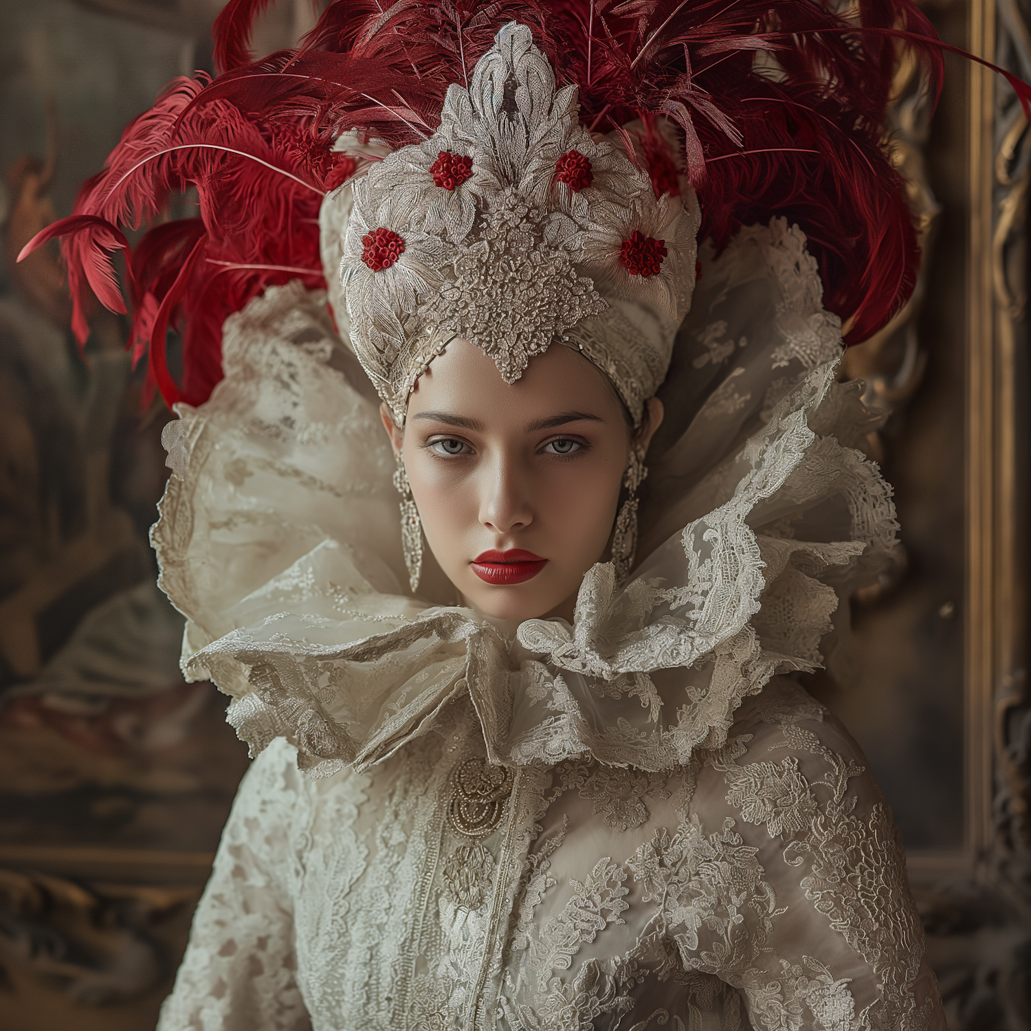 Elegant woman in vintage lace attire with red feathered headdress, bold red lips, and piercing blue eyes in a regal setting.
