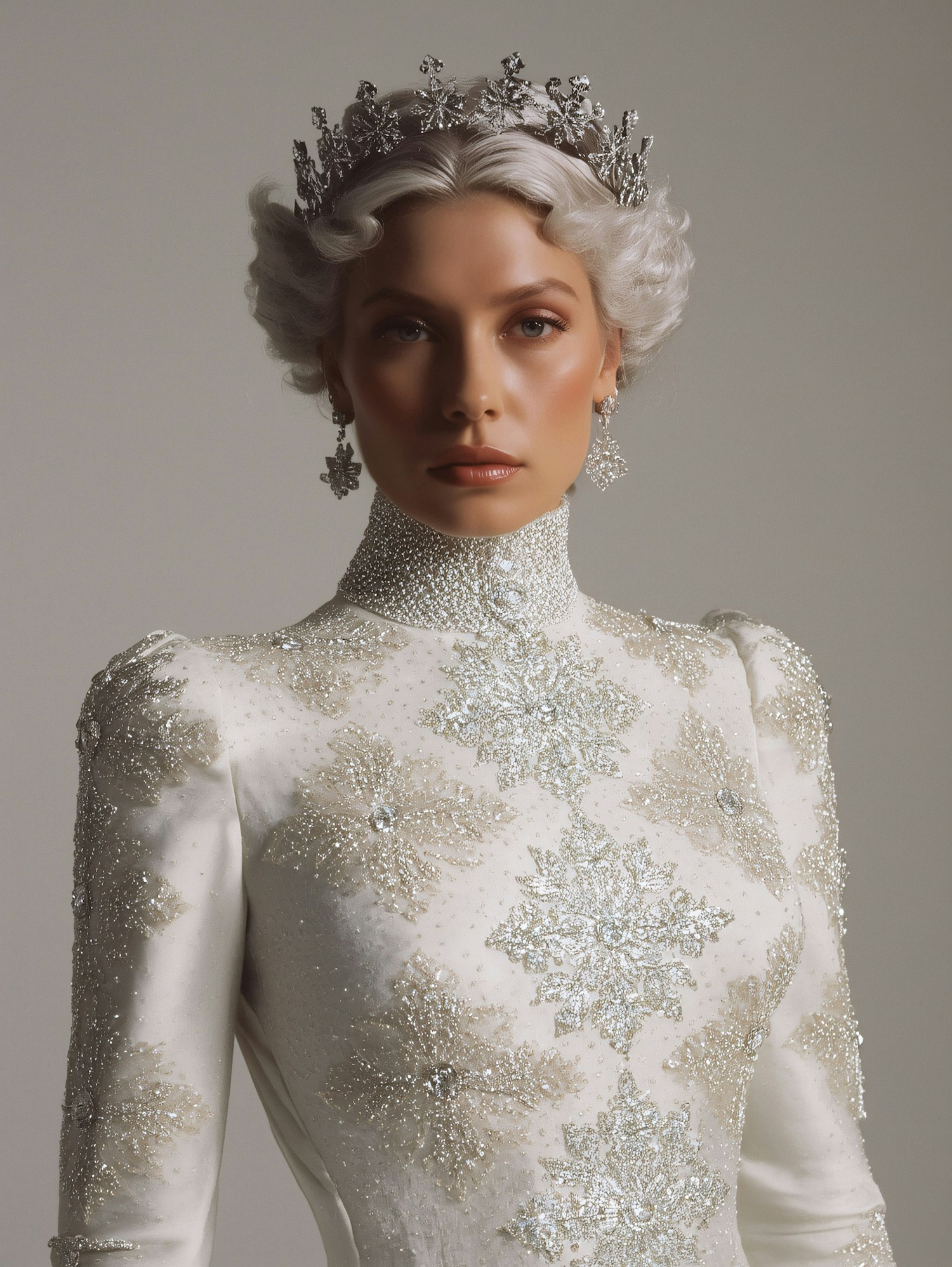 A regal figure in a white gown with silver embroidery and a crown, exuding elegance and sophistication against a neutral backdrop.