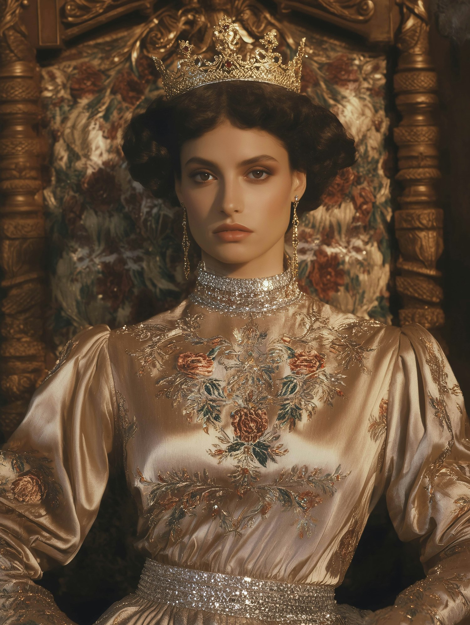 A regal woman in a golden crown and embroidered gown sits on an ornate throne, exuding elegance and sophistication.