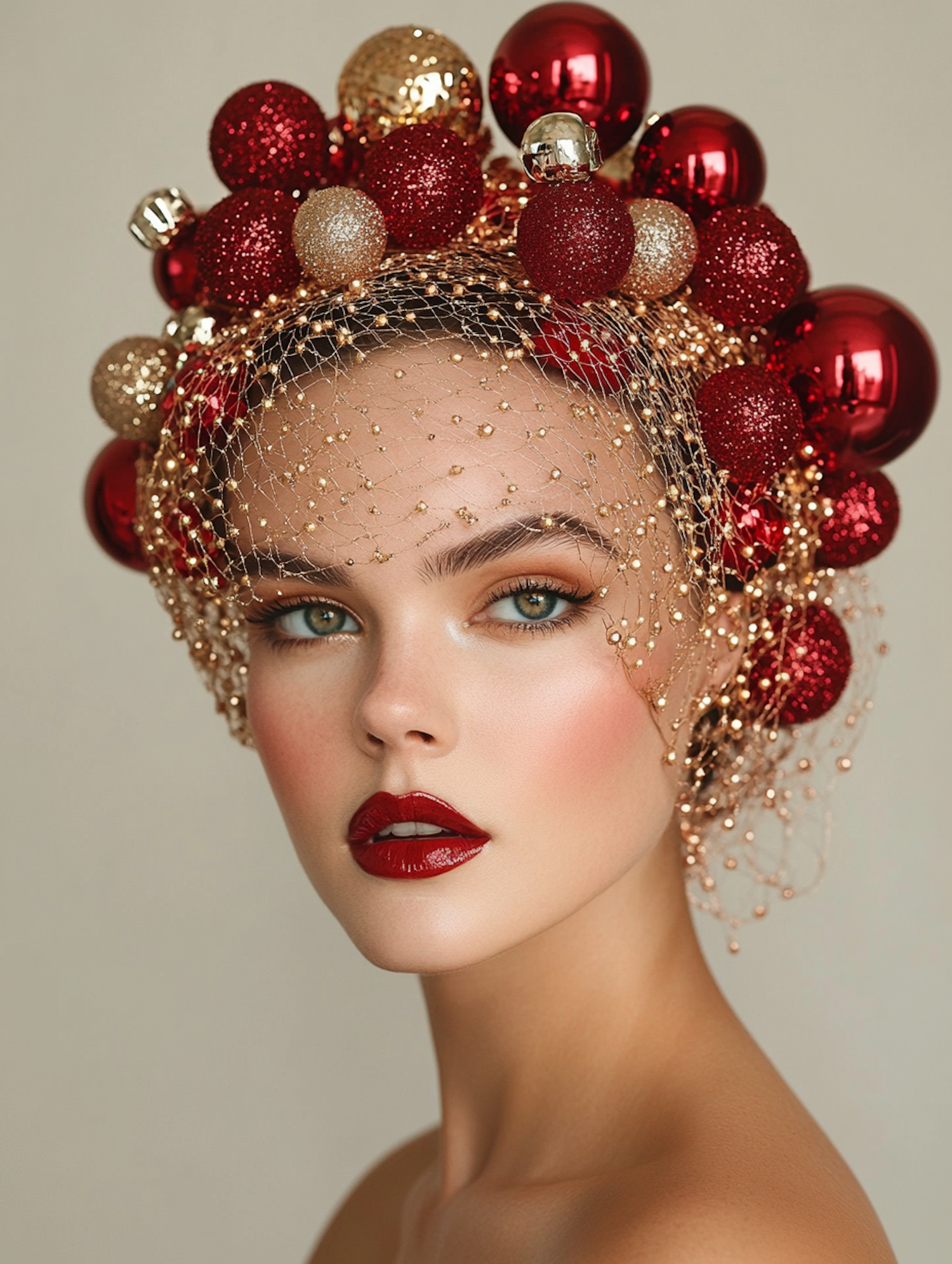 Woman with festive headpiece of red and gold ornaments, bold makeup, and serene expression against a neutral background.