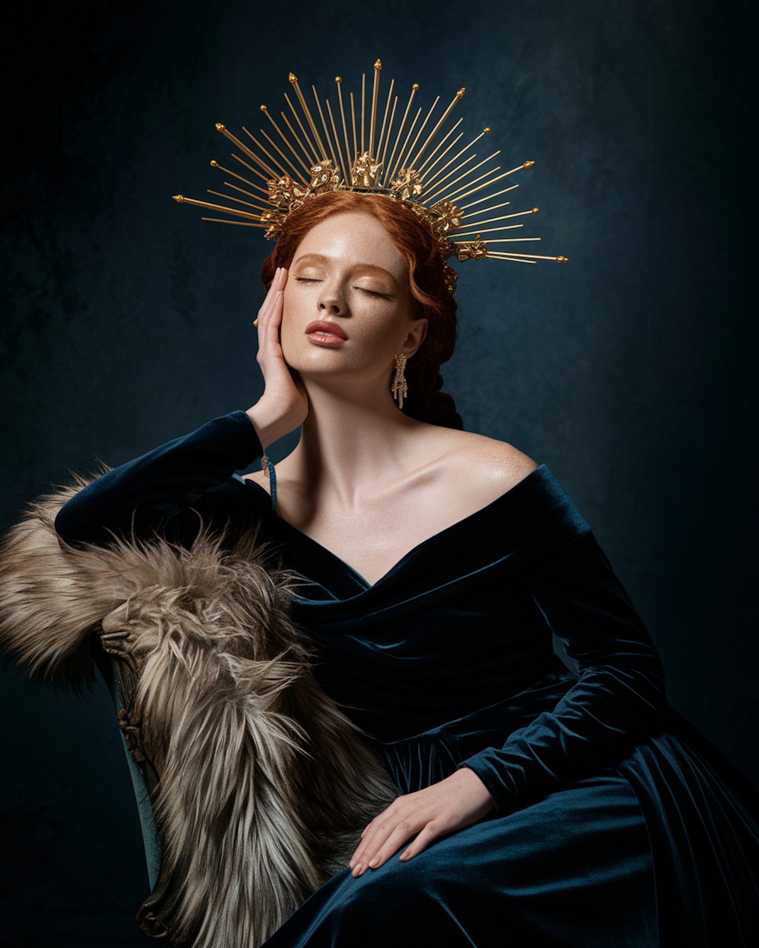 Elegant woman in a blue velvet gown and golden crown, exuding regal charm with serene expression and luxurious details.