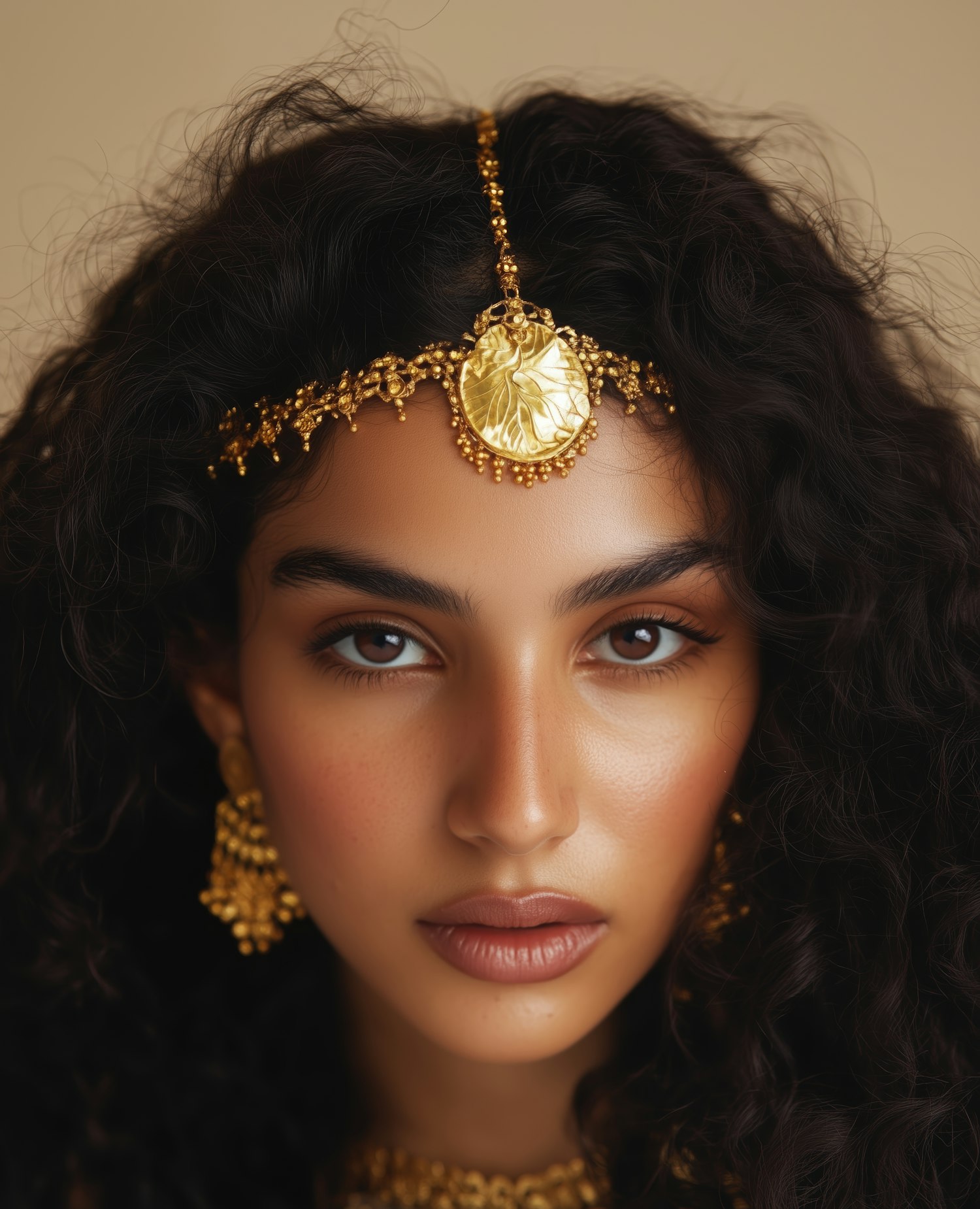 Close-up of a woman with curly hair, wearing intricate gold jewelry and a neutral expression, set against a soft background.