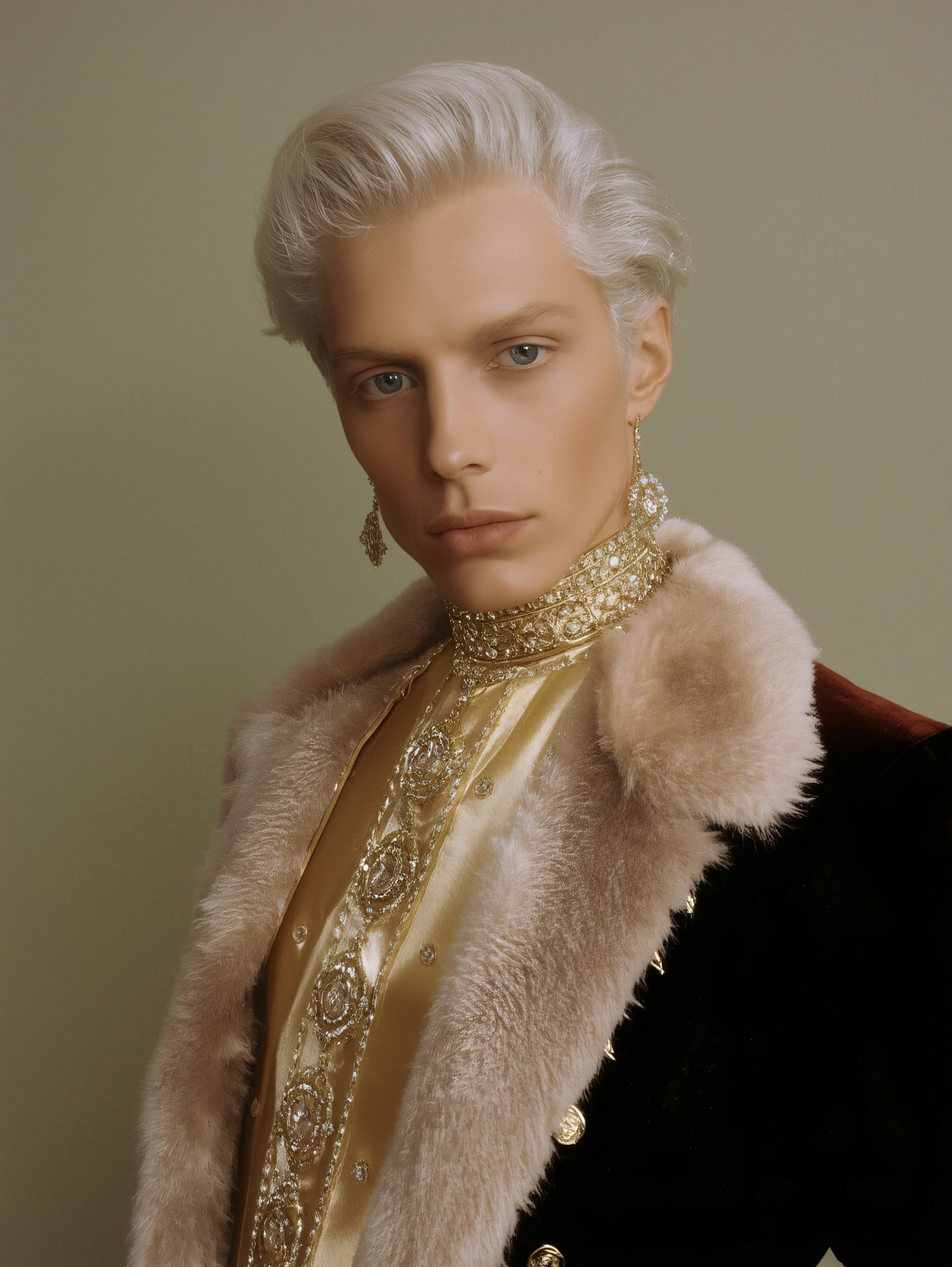 A person in a luxurious golden and fur-lined outfit with platinum blonde hair and ornate accessories, exuding elegance and sophistication.
