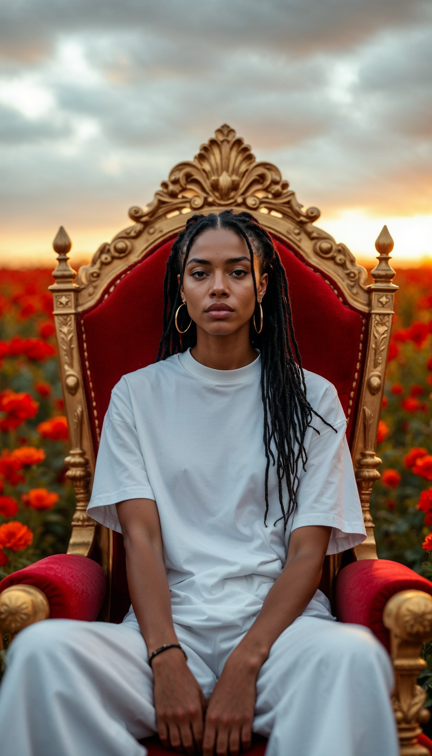 A woman with dreadlocks sits on a golden throne in a field of red flowers, exuding confidence and elegance under a dramatic sunset.