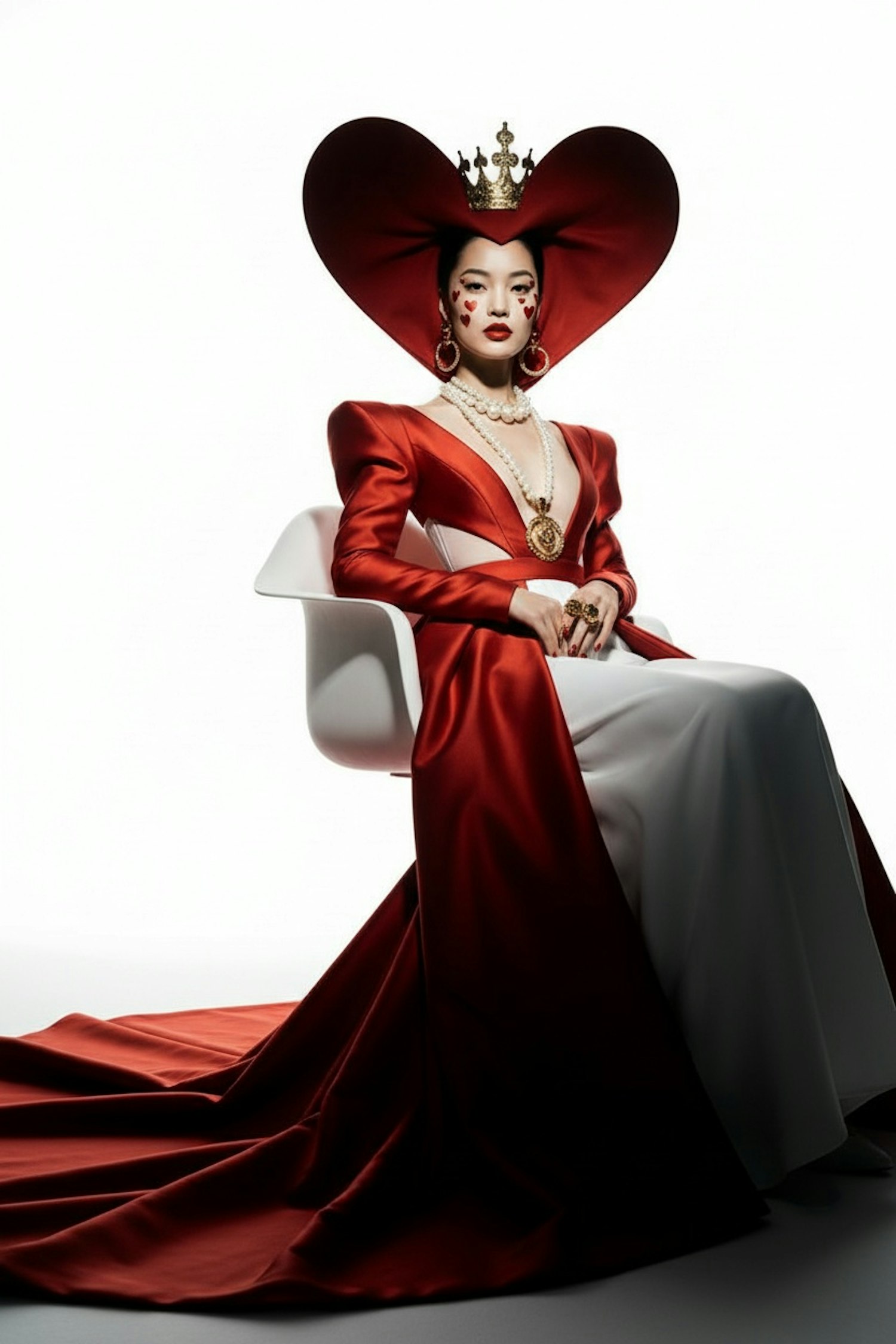 A striking portrait of a person in a regal red and white gown with a heart-shaped hat and crown, exuding elegance and theatrical flair.