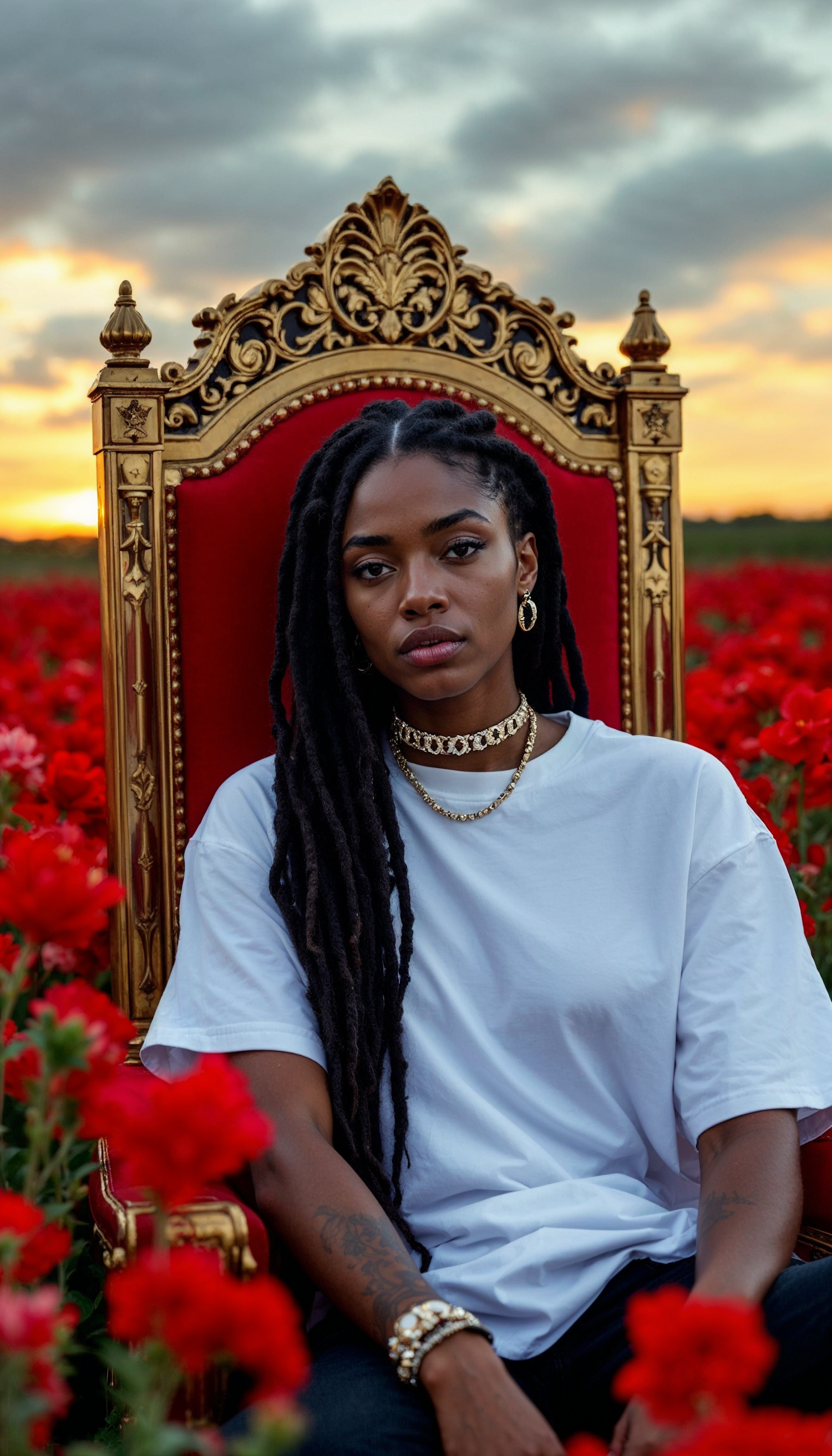 A woman with dreadlocks sits on a golden throne in a field of red flowers at sunset, wearing a white t-shirt and gold jewelry.