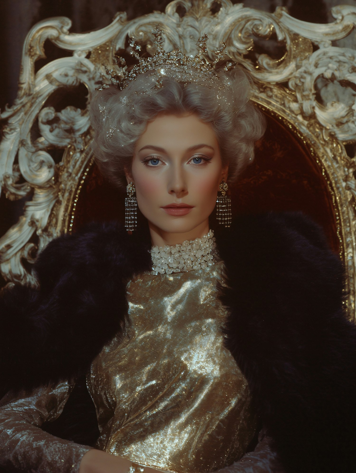 A regal figure in a gold gown and crown sits on an ornate throne, exuding elegance and authority in a richly detailed setting.