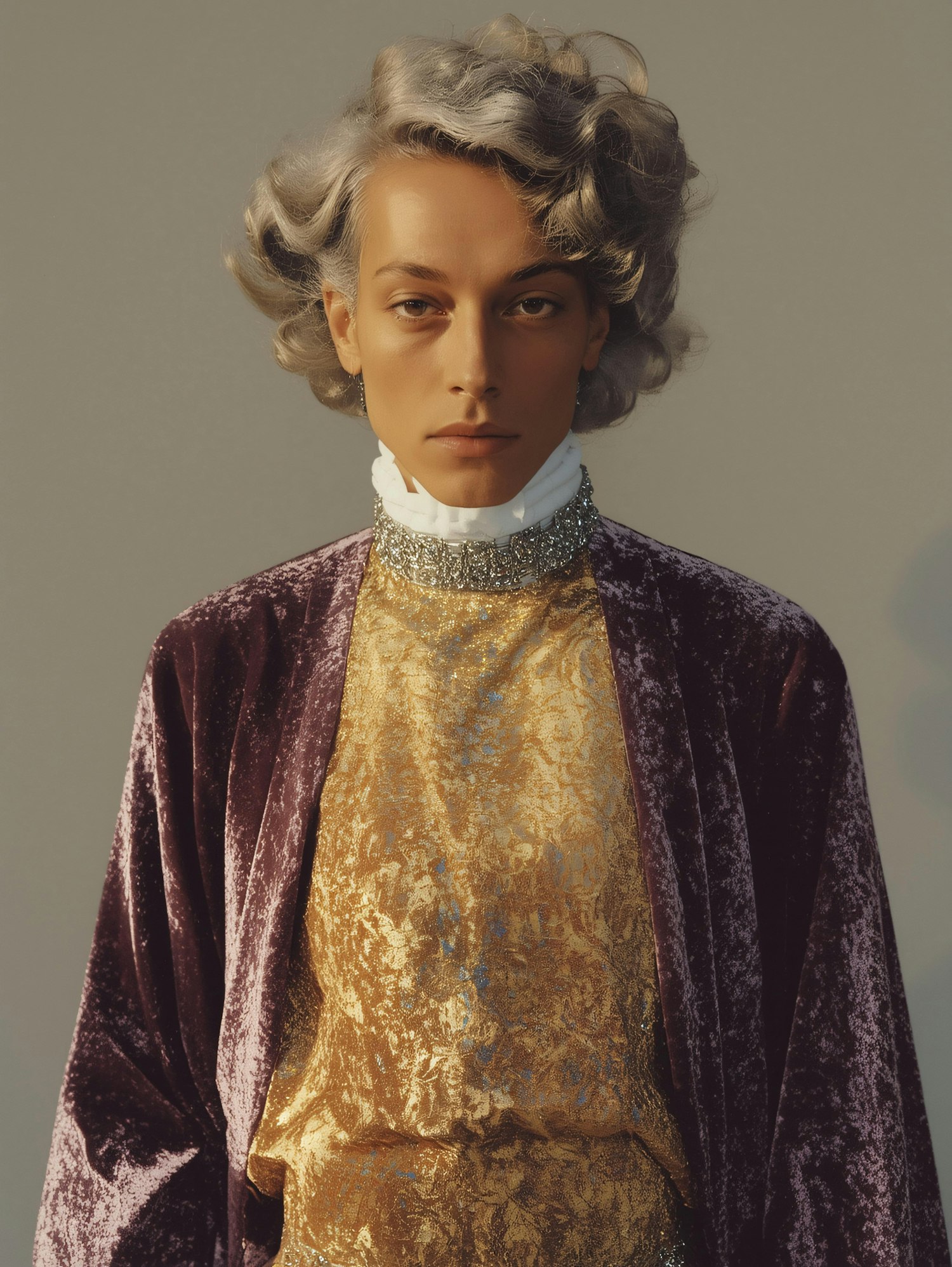 A person with silver hair in a vintage style wears a gold brocade top and purple velvet jacket, exuding elegance and sophistication.