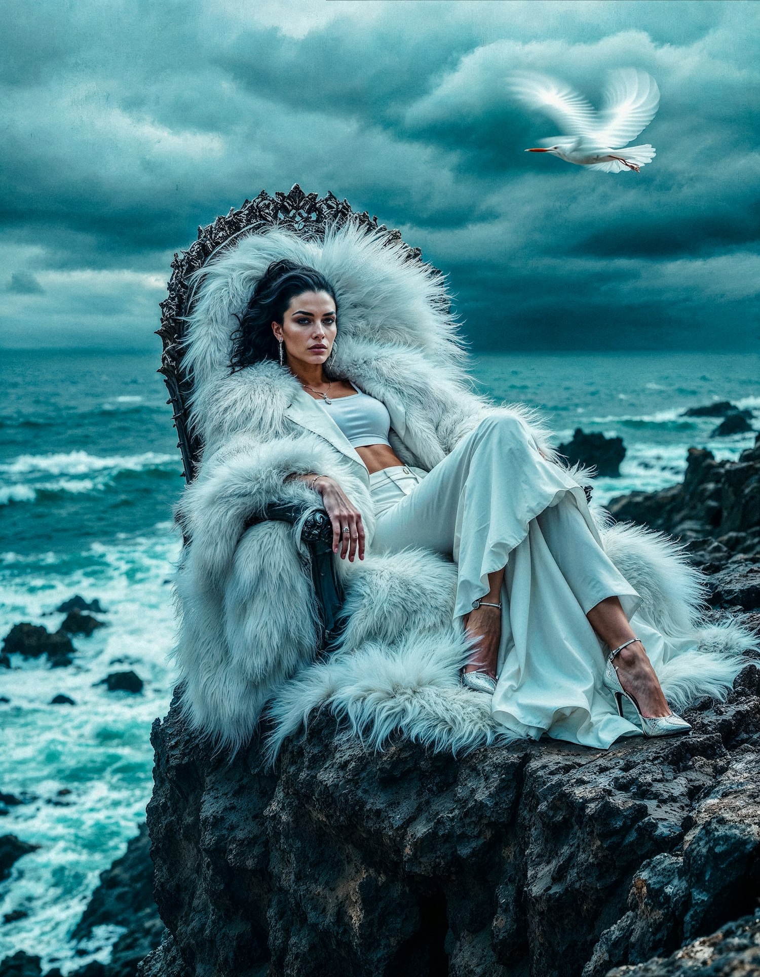 A woman in a fur coat sits on a throne by the stormy ocean, with dramatic skies and a white bird in flight adding to the ethereal vibe.