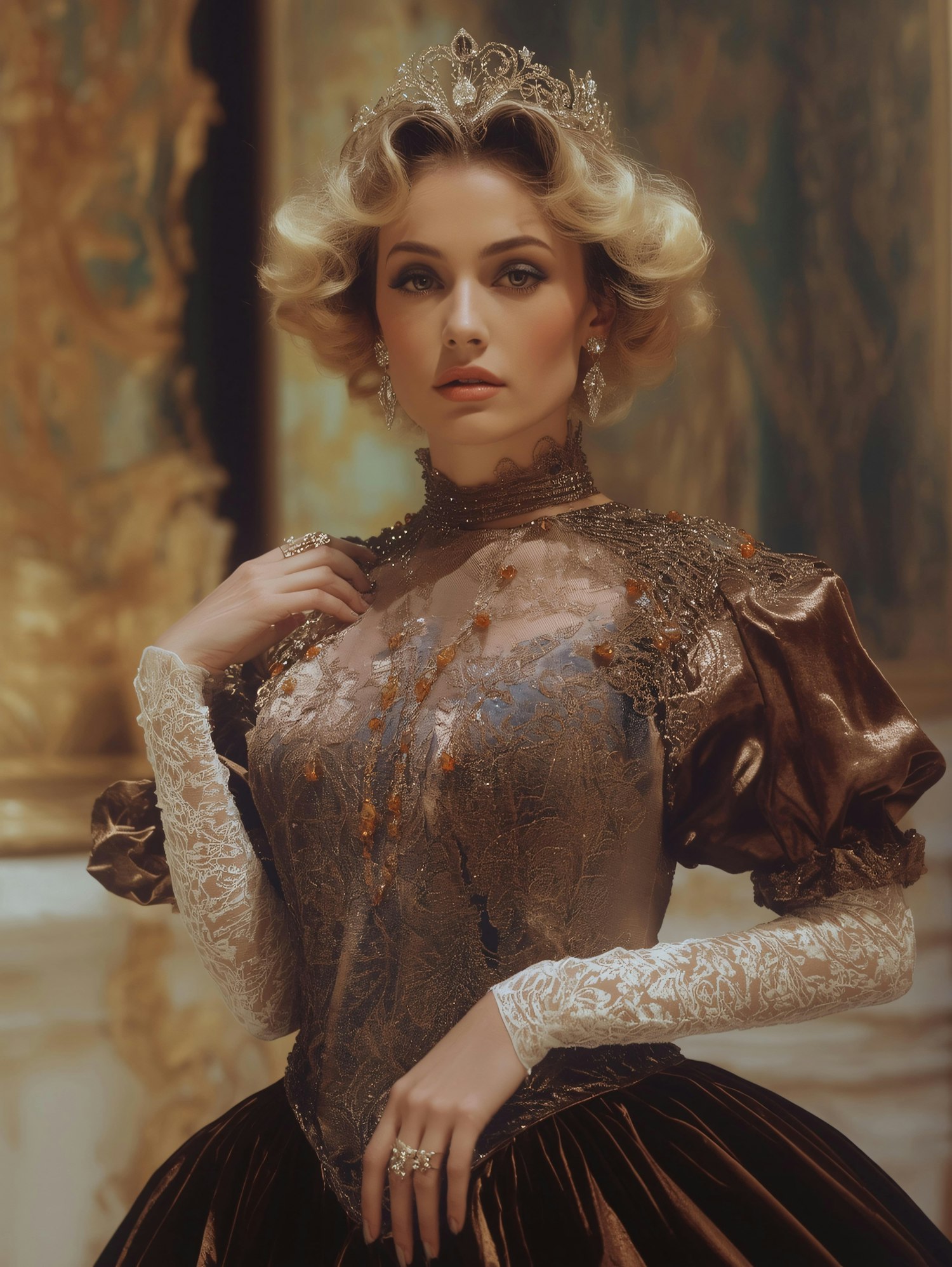 A regal woman in an ornate gown and tiara stands in a luxurious setting, exuding elegance and sophistication.