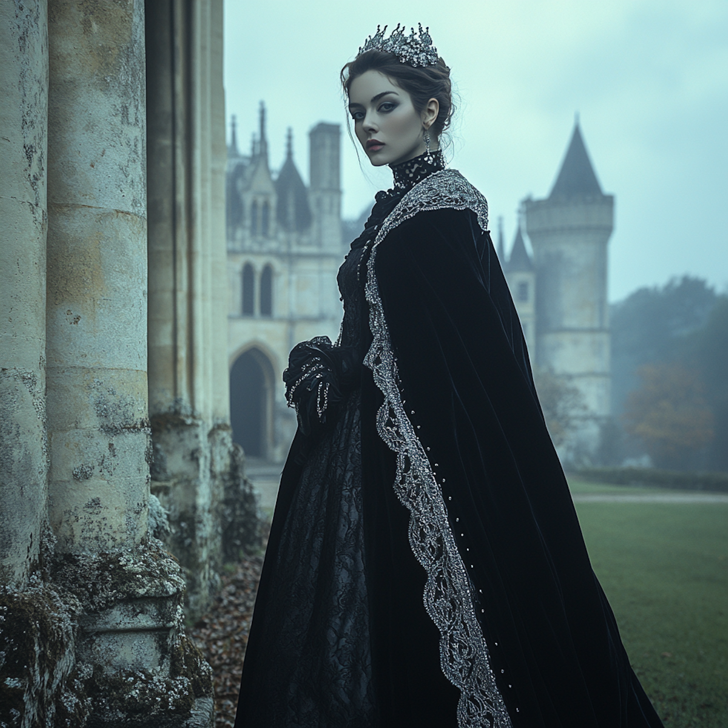 Regal woman in a black gown with silver embroidery stands before a gothic castle, exuding elegance and mystery in a misty setting.