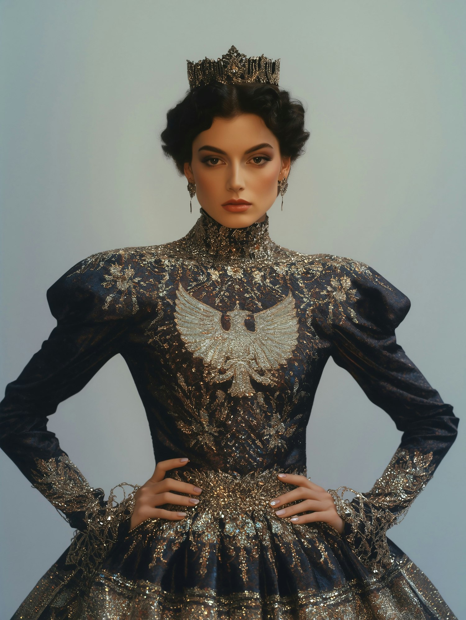 A woman in a dark blue and gold embroidered gown with a crown, exuding elegance and regality against a neutral background.