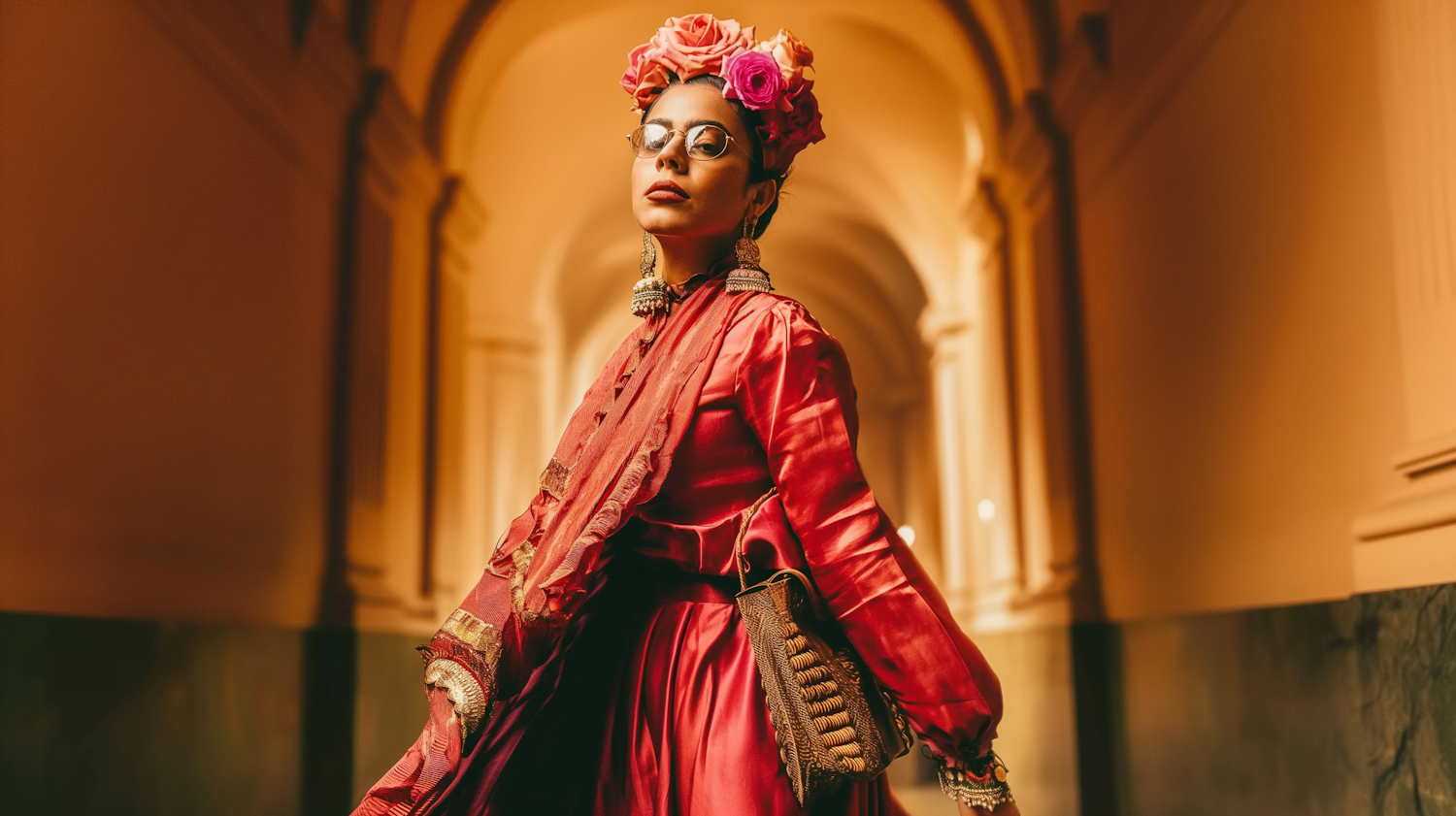 Elegant woman in red dress with floral crown and glasses in ornate hallway, exuding confidence and style.
