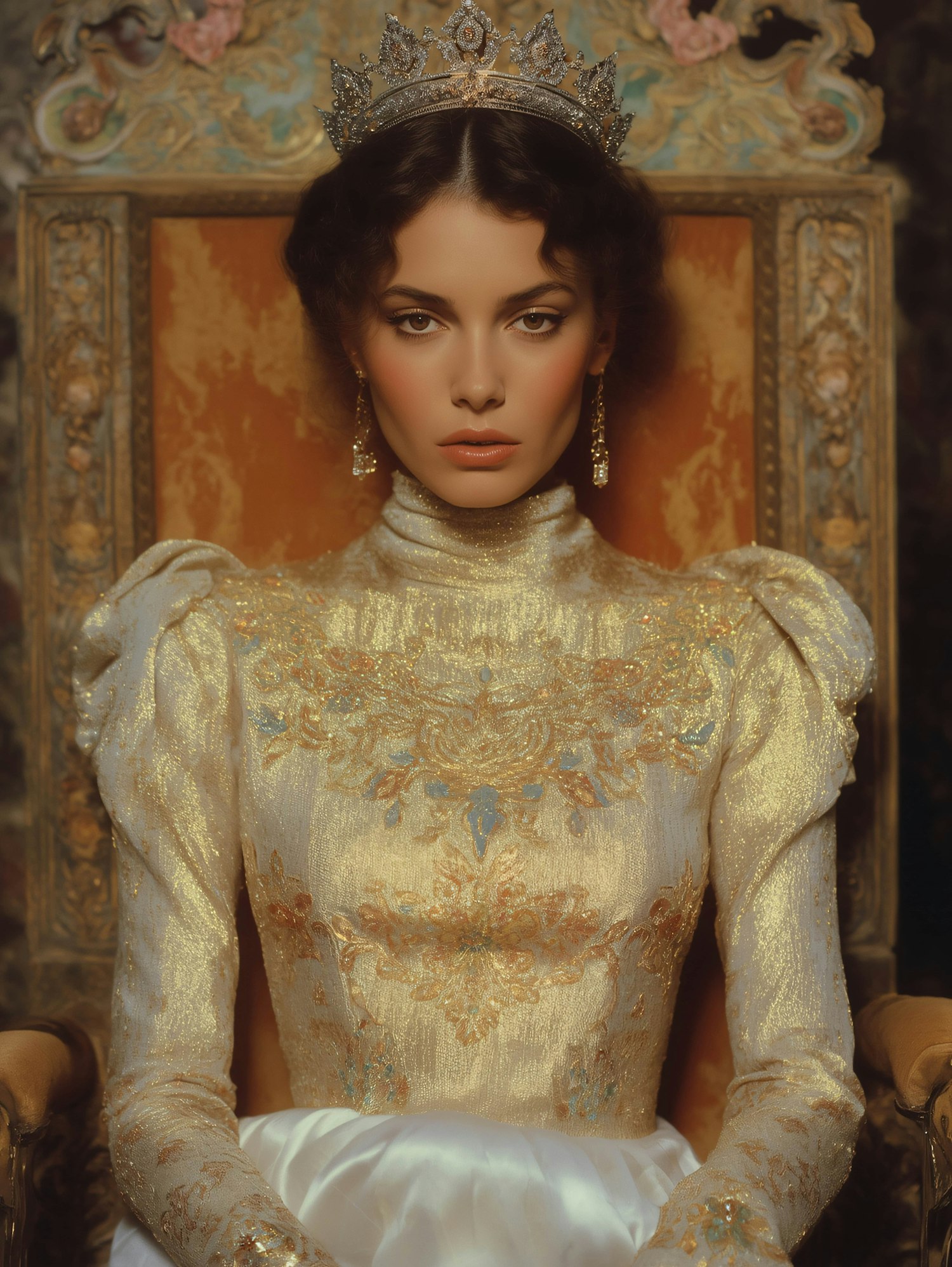 A regal woman in a golden embroidered gown and jeweled crown sits on an ornate throne, exuding elegance and authority.