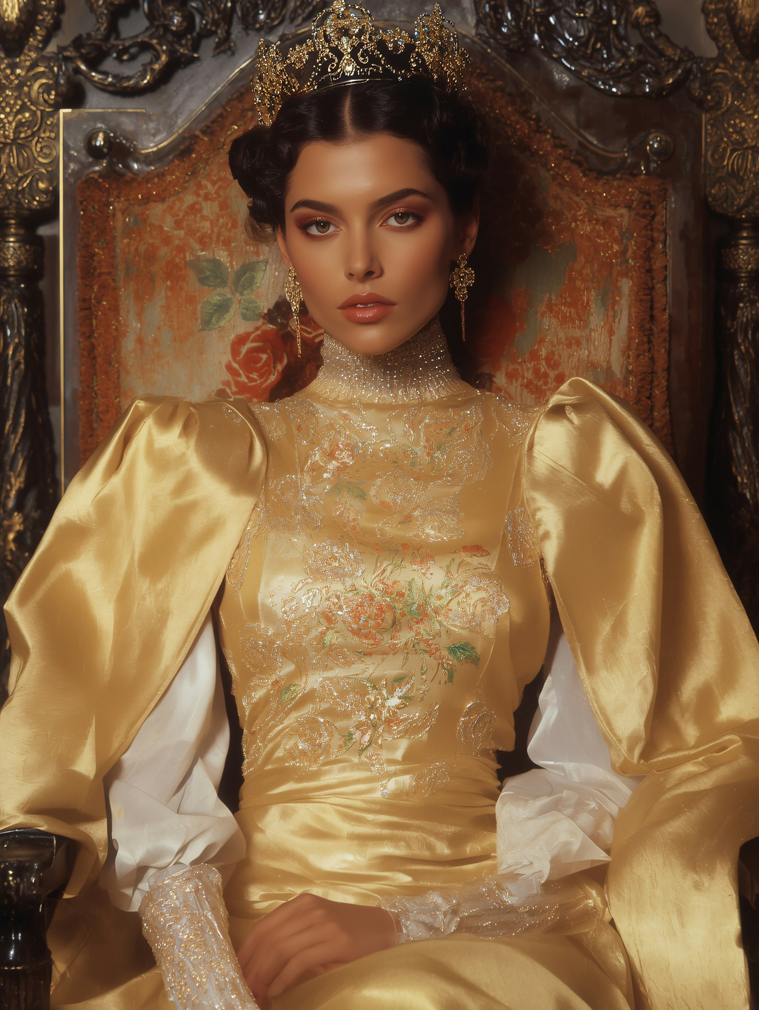 A regal woman in a golden gown and crown sits on an ornate throne, exuding elegance and sophistication in a luxurious setting.