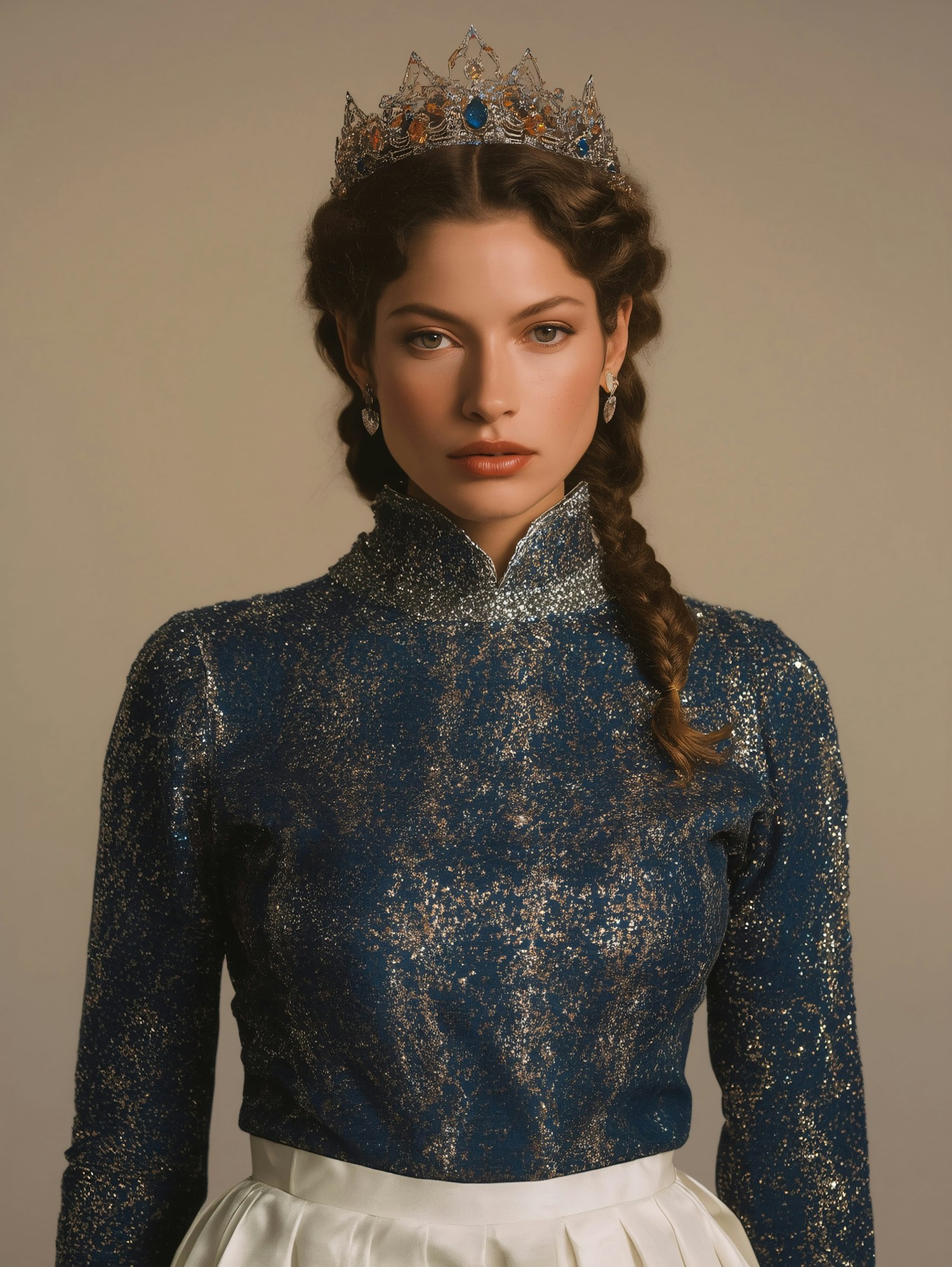 A regal woman in a sparkling blue top and white skirt, adorned with a silver crown with gemstones, exudes elegance and poise.